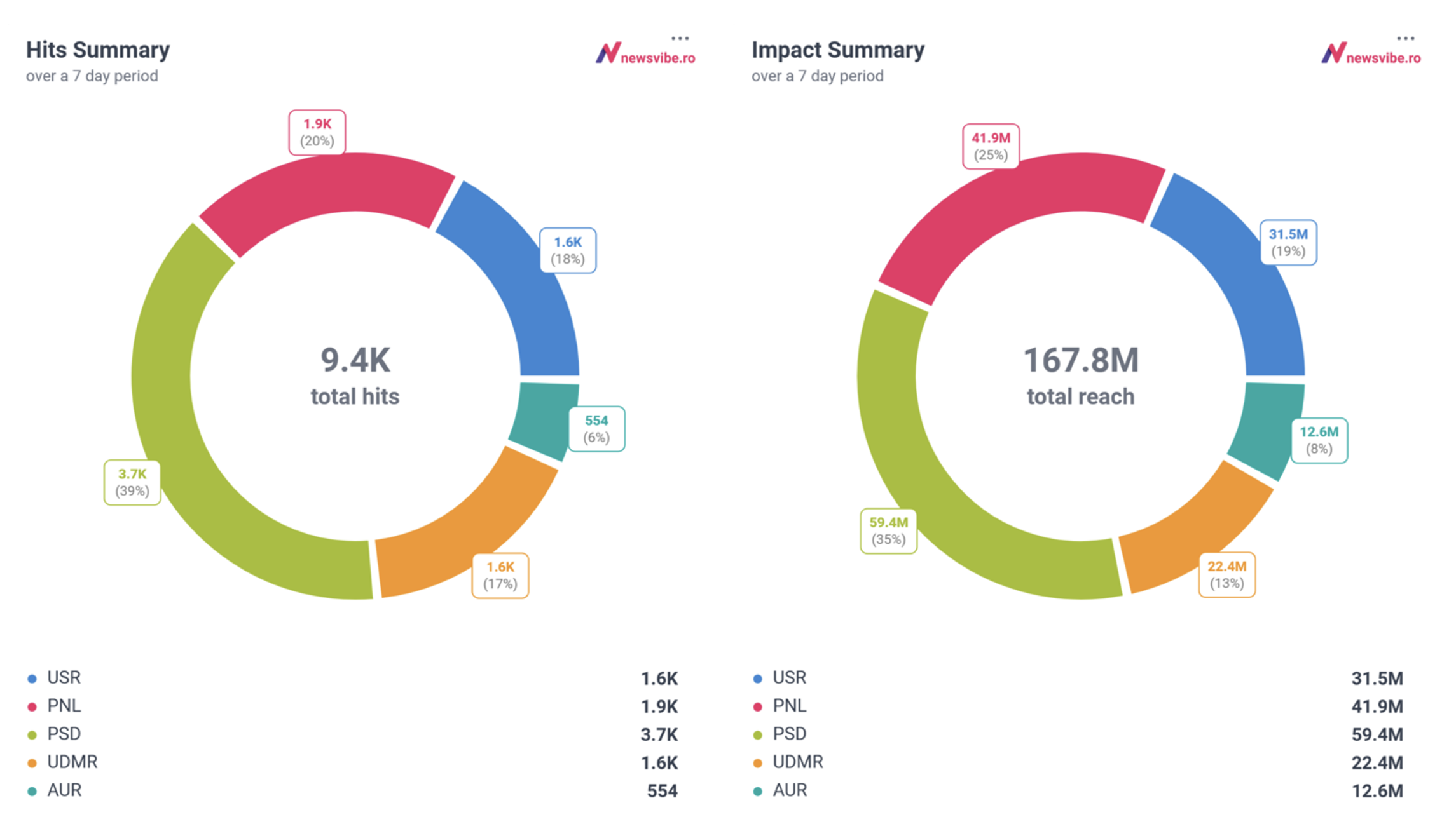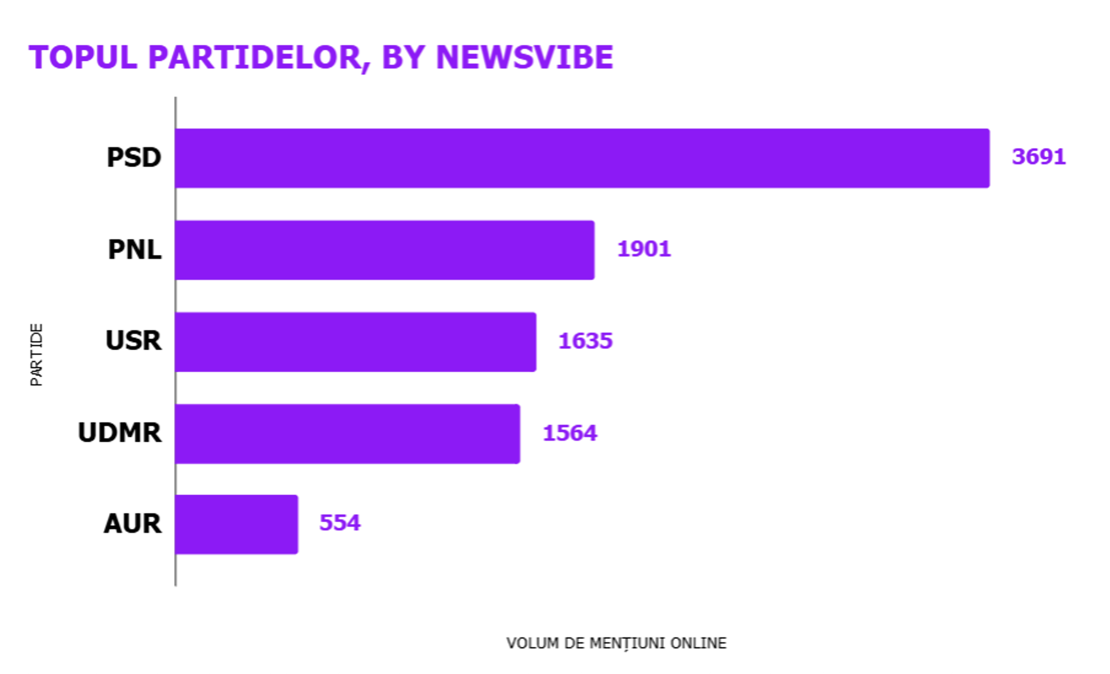 UDMR ist der Performer der analysierten Periode, mit einem spektakulären Anstieg von über 190% der Erwähnungen im Vergleich zur vorherigen Woche, als Folge der Sichtbarkeit, die durch den Kongress der von Kelemen Hunor geleiteten Formation erzeugt wurde. PSD verzeichnet ebenfalls einen wichtigen Anstieg von über 66%, während USR fast 85% erreicht. Die Zuwächse von PNL und AUR, obwohl vorhanden, sind im Vergleich zu den ersten drei genannten Parteien geringer.