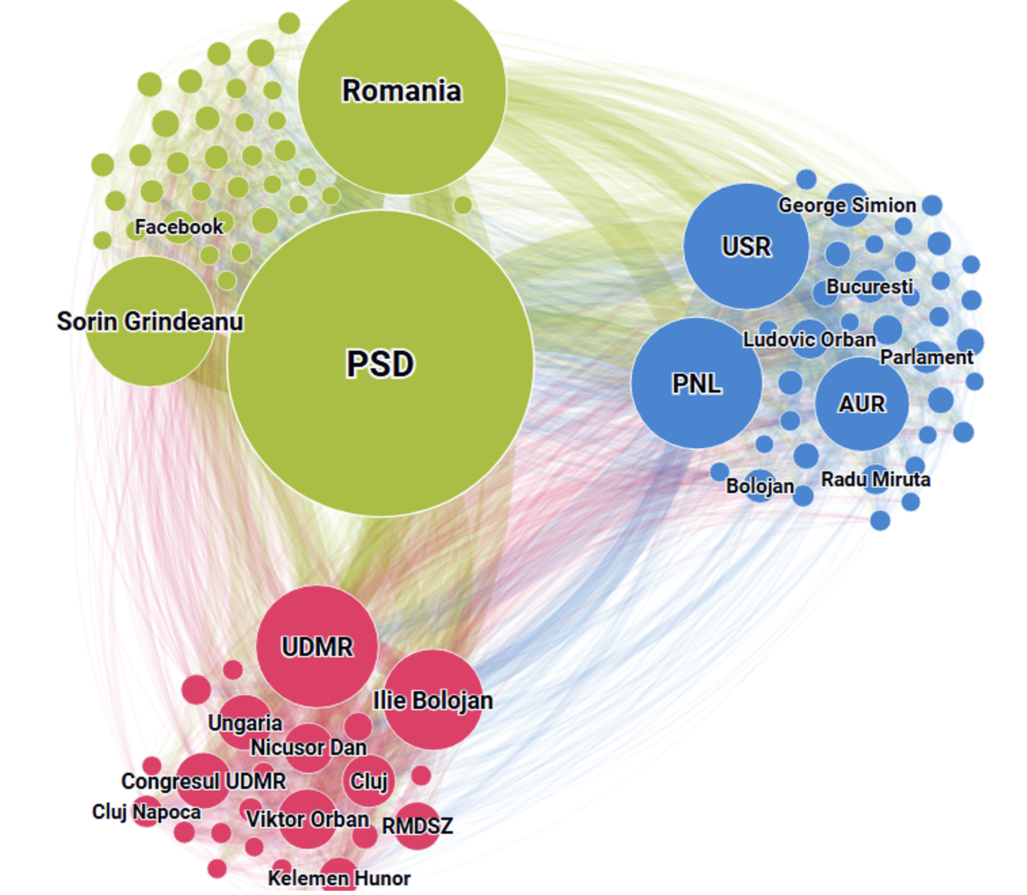- Ein distinctes Segment mit mehreren internen Verbindungen hat PNL, AUR und USR im Zentrum, aber auch assoziierte Entitäten wie Ludovic Orban, George Simion, Parlament oder Radu Miruță. Dieser Bereich wird von den Diskussionen über die Wahlen in Bukarest beeinflusst, aber auch von den Aktionen von AUR im Parlament – wie dem Antrag gegen den Wirtschaftsminister oder der Ankündigung, neue Anträge einzureichen, die sich gegen alle Mitglieder des Kabinetts richten.