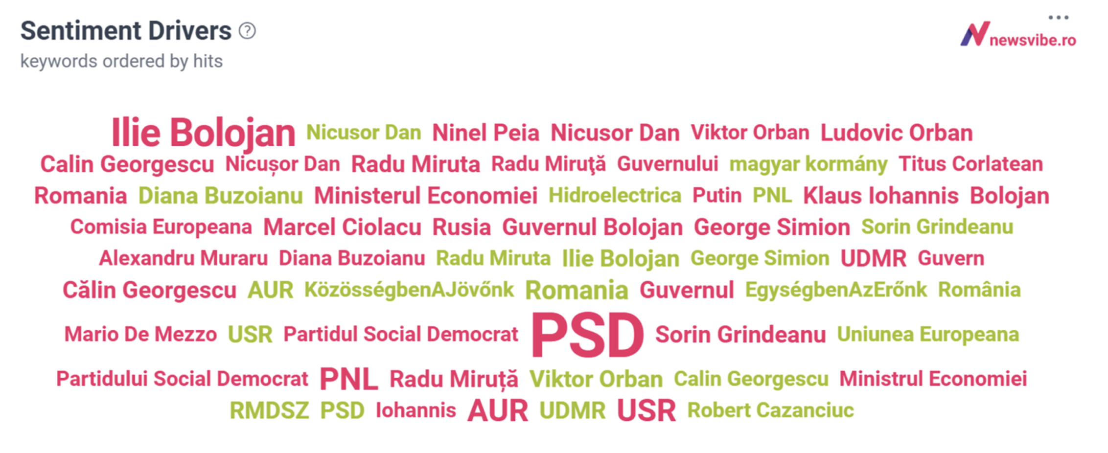 - PSD und Ilie Bolojan sind die politischen Akteure, die am häufigsten von Online-Quellen in negativen, umstrittenen oder polarisierten Kontexten medialisiert werden. Dieser Kontext wird hauptsächlich durch die Streitigkeiten in der Koalition über die Regierungspolitik oder die Organisation der Wahlen für das Bürgermeisteramt von Bukarest erzeugt.