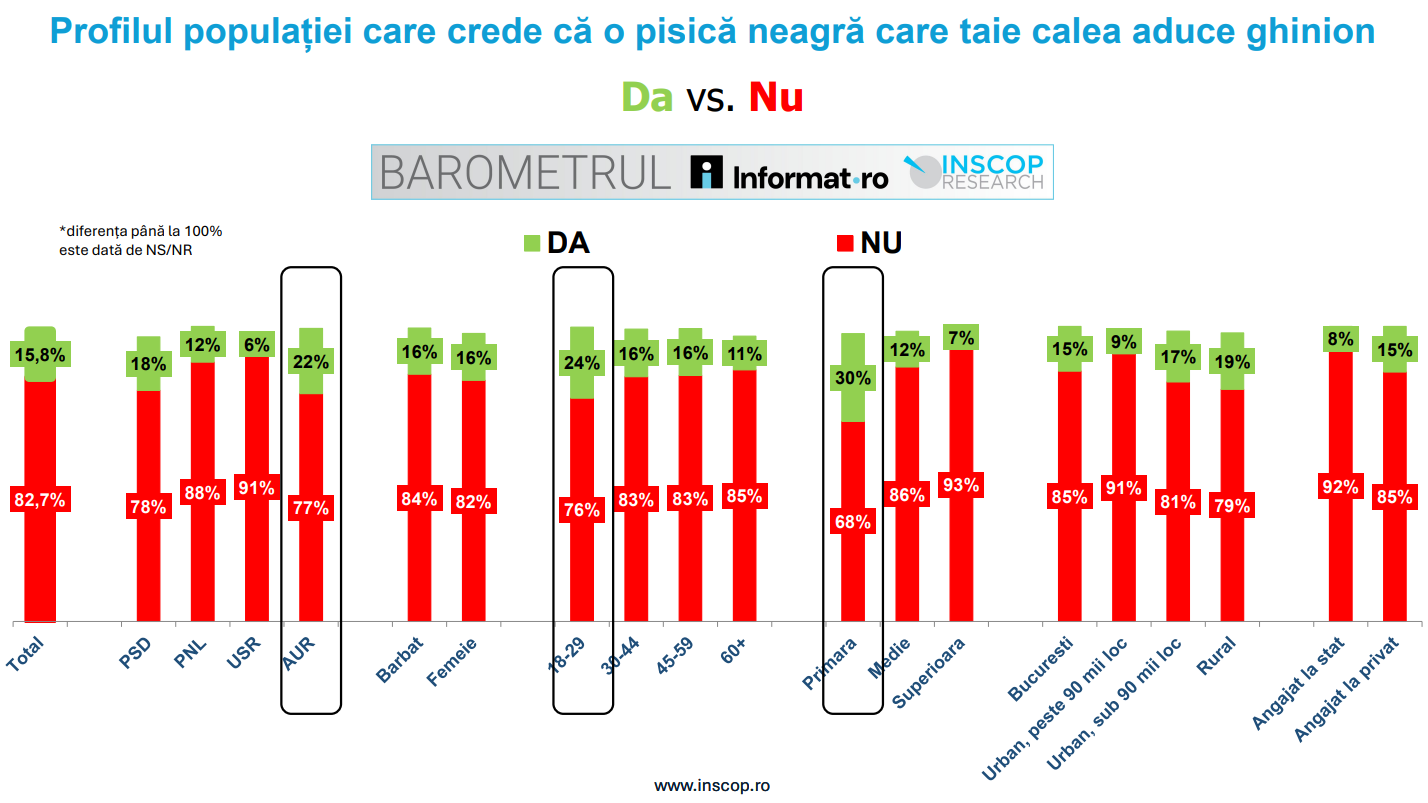 15,8 % der Rumänen glauben, dass, wenn eine schwarze Katze ihnen den Weg kreuzt, dies Unglück bringen wird. 82,7 % glauben nicht an diesen Aberglauben, und 1,5 % wissen nicht oder antworten nicht.