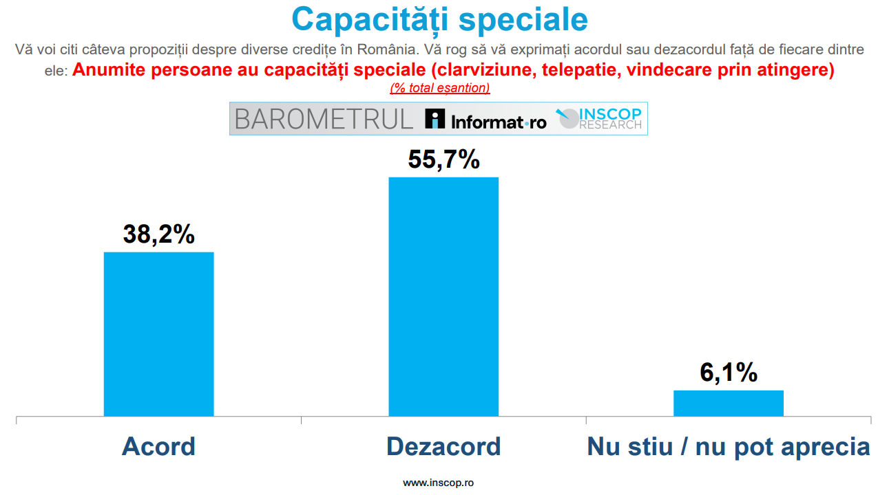 38,2 % der Rumänen stimmen der Aussage zu: „Einige Personen haben besondere Fähigkeiten (Hellsehen, Telepathie, Heilung durch Berührung)“, während 55,7 % dagegen sind. 6,1 % wissen nicht oder antworten nicht.