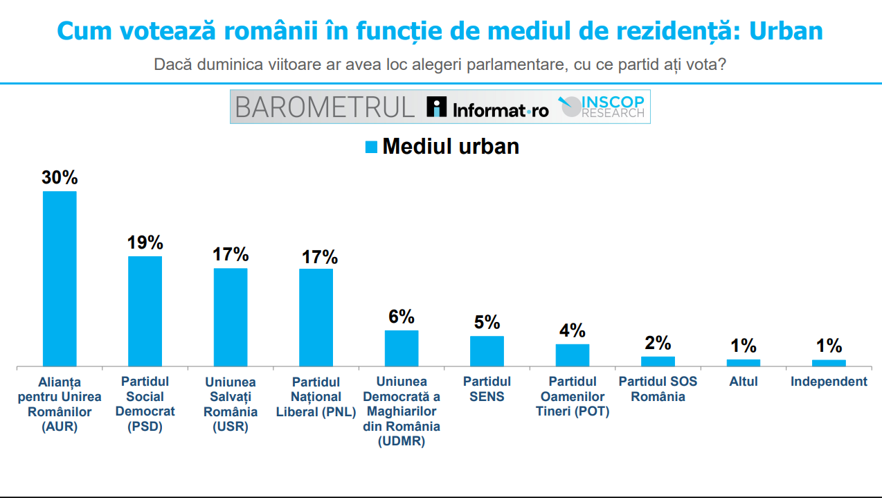 30% of people living in urban areas would choose to vote for AUR if parliamentary elections were held next Sunday. 19% of them support PSD, 17% USR, 17% PNL, 6% UDMR, 5% SENS, 4% POT, and 2% SOS Romania. 1% of them choose another party, while 1% choose an independent candidate.