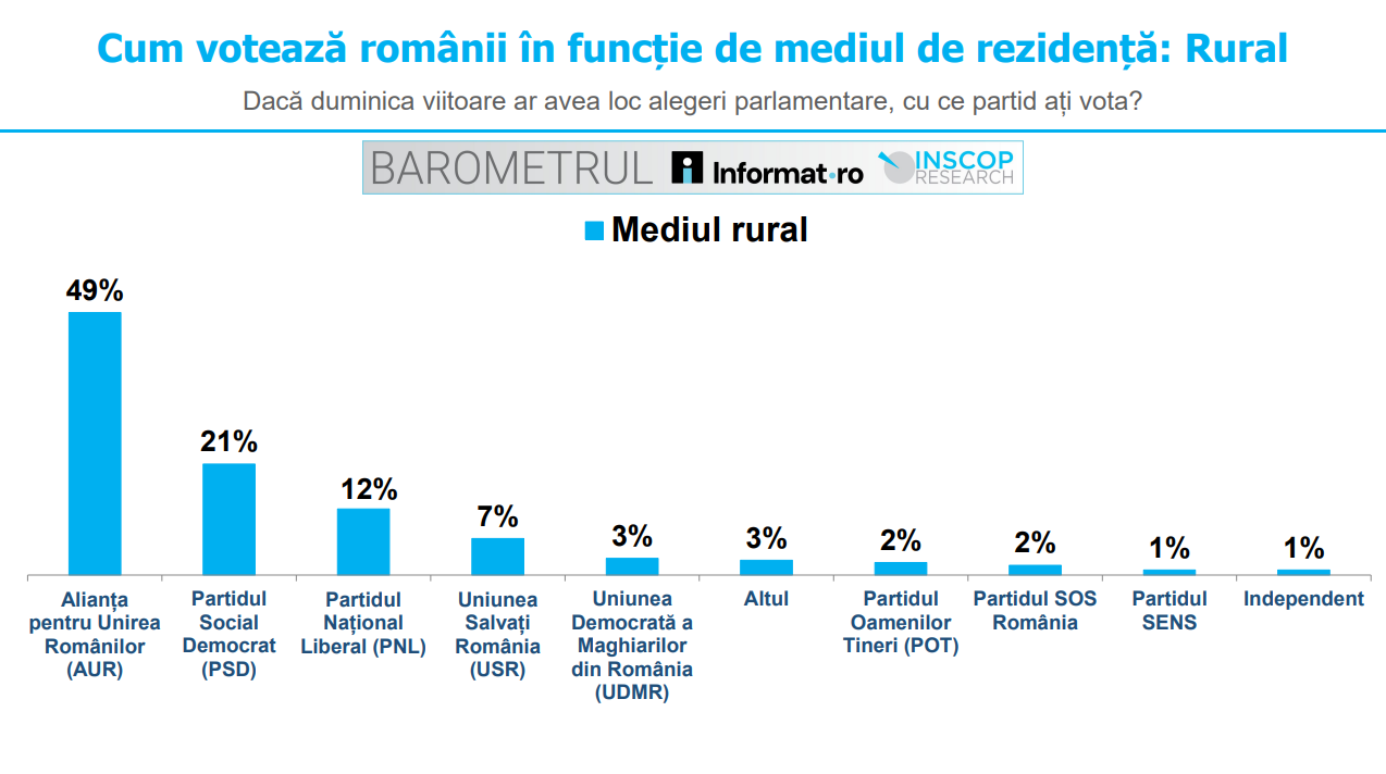 According to BAROMETER Informat.ro – INSCOP Research, edition V, conducted between October 25 – November 2, 2025, both in urban and rural areas, AUR and PSD lead the ranking of voting intentions for parliamentary elections, with the party led by George Simion in first place with 30% in urban areas and 49% in rural areas, while the social democrats occupy second place with 19% and 21%, respectively.