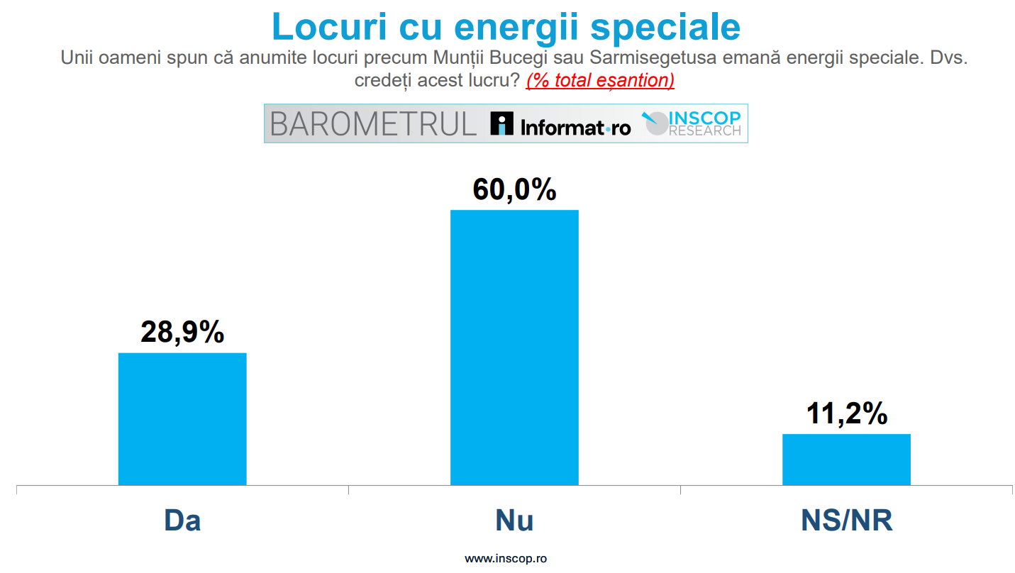 28.9% of Romanians believe that certain places such as the Bucegi Mountains or Sarmisegetusa emanate special energies. 60% hold the opposite opinion, while 11.2% do not know or do not respond.