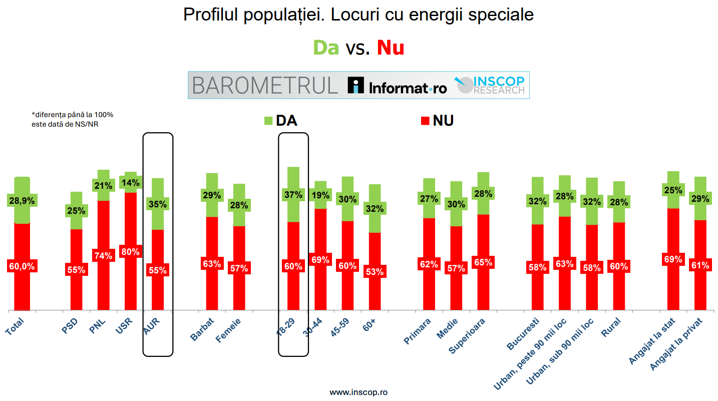 Those who believe that certain places such as the Bucegi Mountains or Sarmisegetusa emanate special energies are mainly: AUR voters and young people under 30. PNL and USR voters, as well as individuals aged between 30 and 44, at least believe in the existence of such places.
