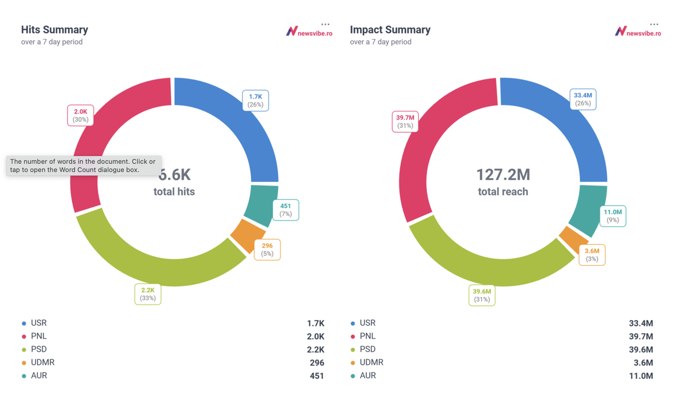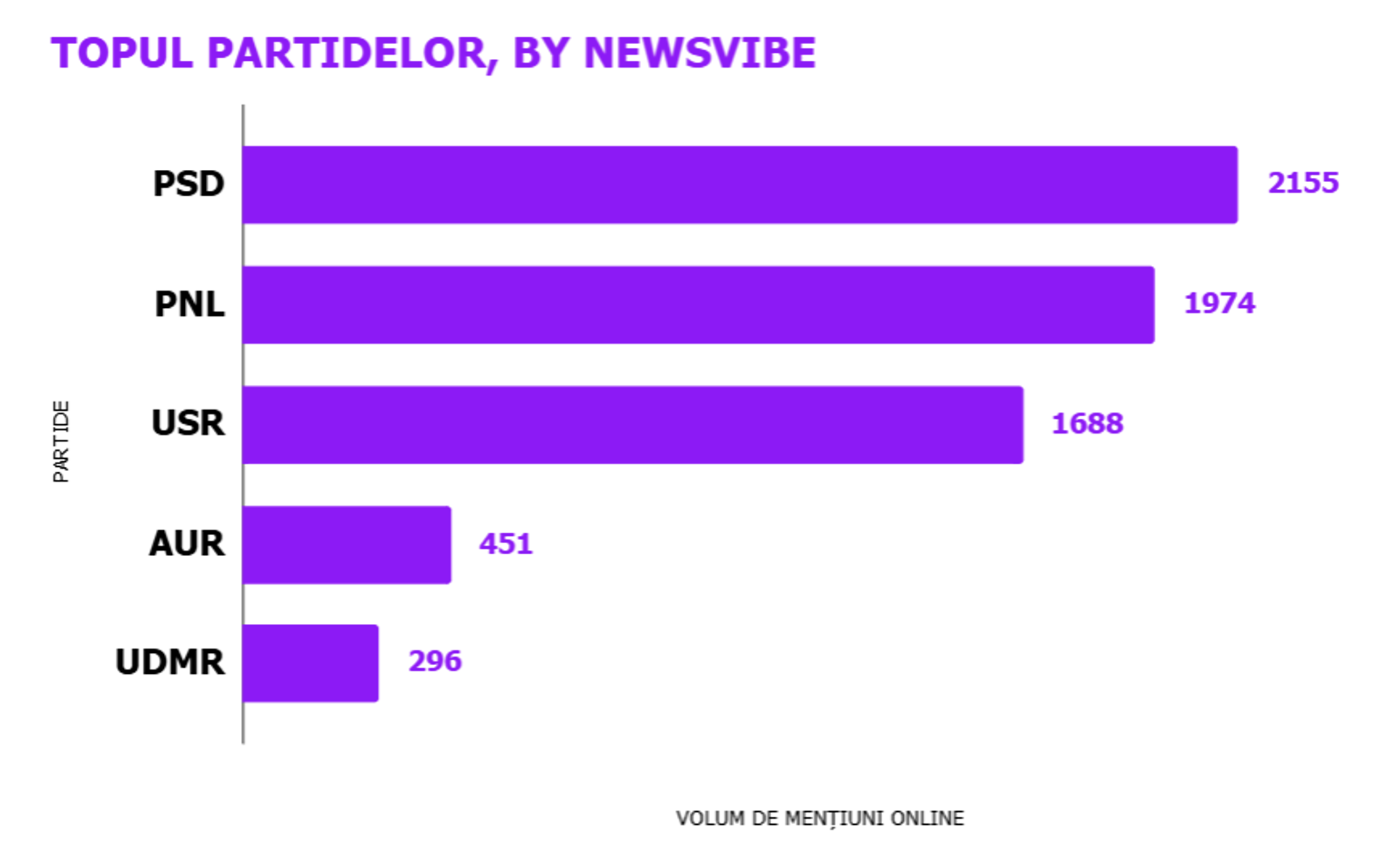 En comparación con la semana pasada, el número total de menciones sobre partidos ha disminuido en casi 2,000, y el impacto estimado de las mismas en alrededor de 50 millones. PSD, PNL, USR y UDMR siguen estando en primer plano en términos de visibilidad, sumando más del 90% del número total de menciones y más del 90% del impacto.