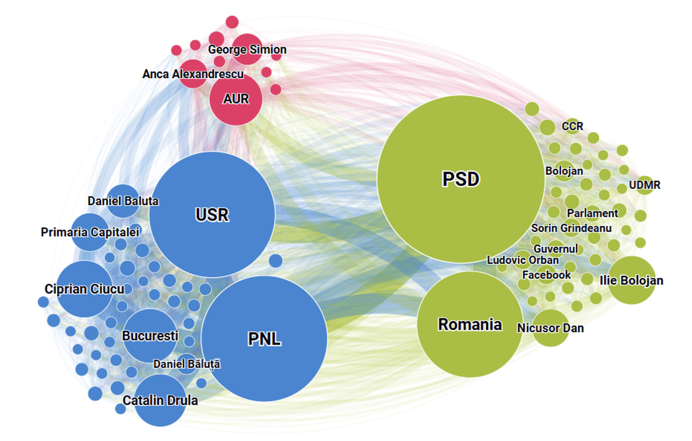 - Otro segmento consistente de la comunicación online se centra exclusivamente en las elecciones para la Alcaldía de la Capital, donde en el centro de las discusiones se encuentran USR y PNL, en estrecha conexión con nombres de candidatos como Ciprian Ciucu, Daniel Băluță, Cătălin Drulă, así como con instituciones asociadas a la zona administrativa de la Capital.
