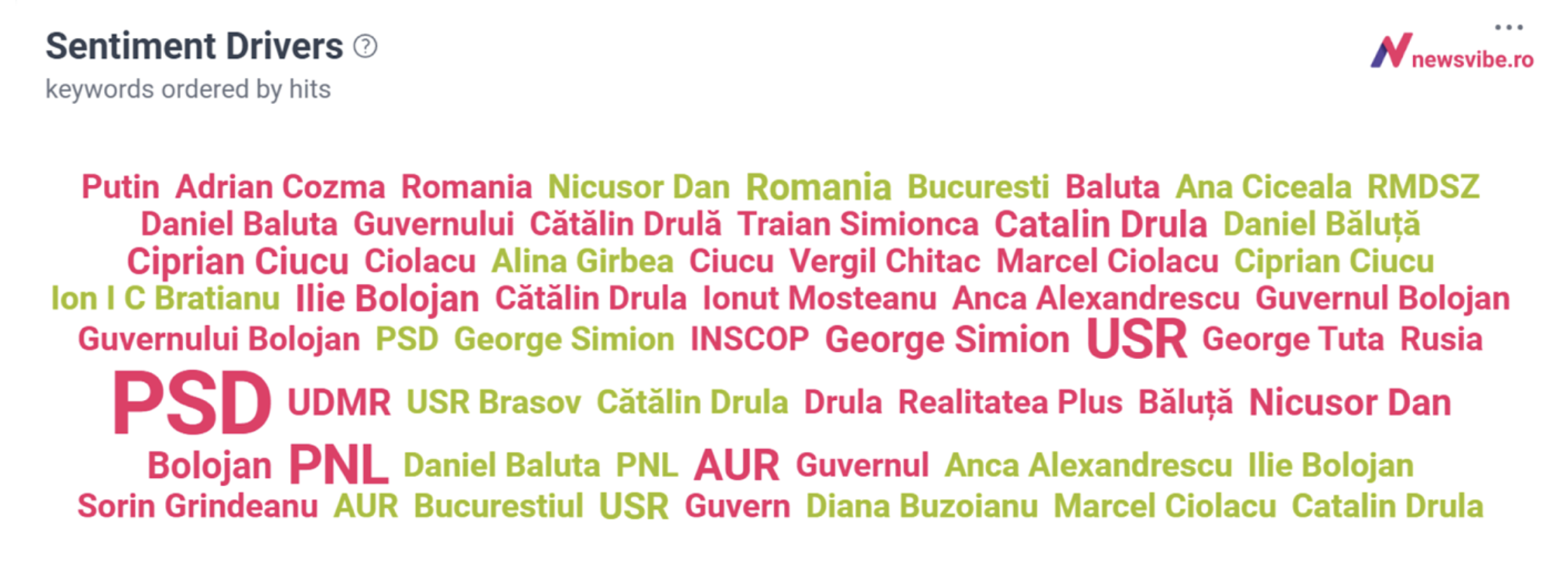 - PSD (en especial), PNL, USR y AUR son los actores que aparecen constantemente en contextos predominantemente negativos en el entorno online. Los partidos son recurrentemente asociados con los nombres de algunos líderes involucrados en las campañas electorales, visibles en las discusiones sobre todo a través de confrontaciones, tensiones y competiciones momentáneas.