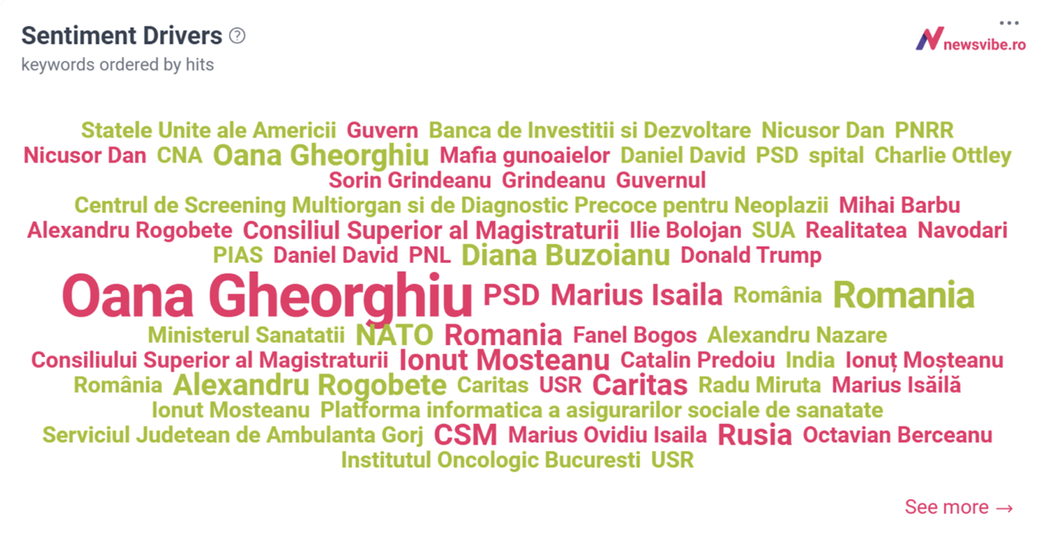 Mediante el uso de tecnologías avanzadas de análisis basadas en inteligencia artificial, la plataforma NewsVibe identifica el tono, el significado y el contexto de las conversaciones en línea sobre actores públicos y temas de actualidad. En el marco de este análisis, se han monitoreado todas las menciones que hacen referencia a los miembros del Gobierno de Rumanía.