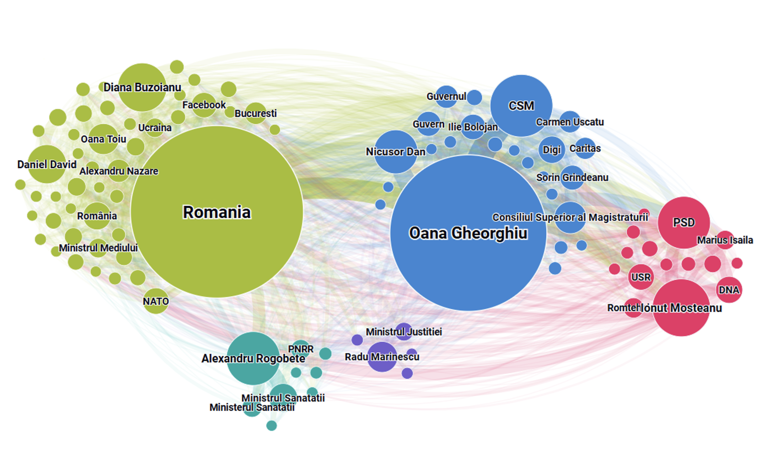 Otro cluster importante tiene como nodo central Rumanía. Este es difuso desde el punto de vista temático, asociando ministros como Diana Buzoianu, Daniel David, Oana Țoiu (USR) o Alexandru Nazare (PNL). El cluster representa el contexto general de los debates sobre Rumanía, cubriendo la temática y la comunicación ministerial específica.