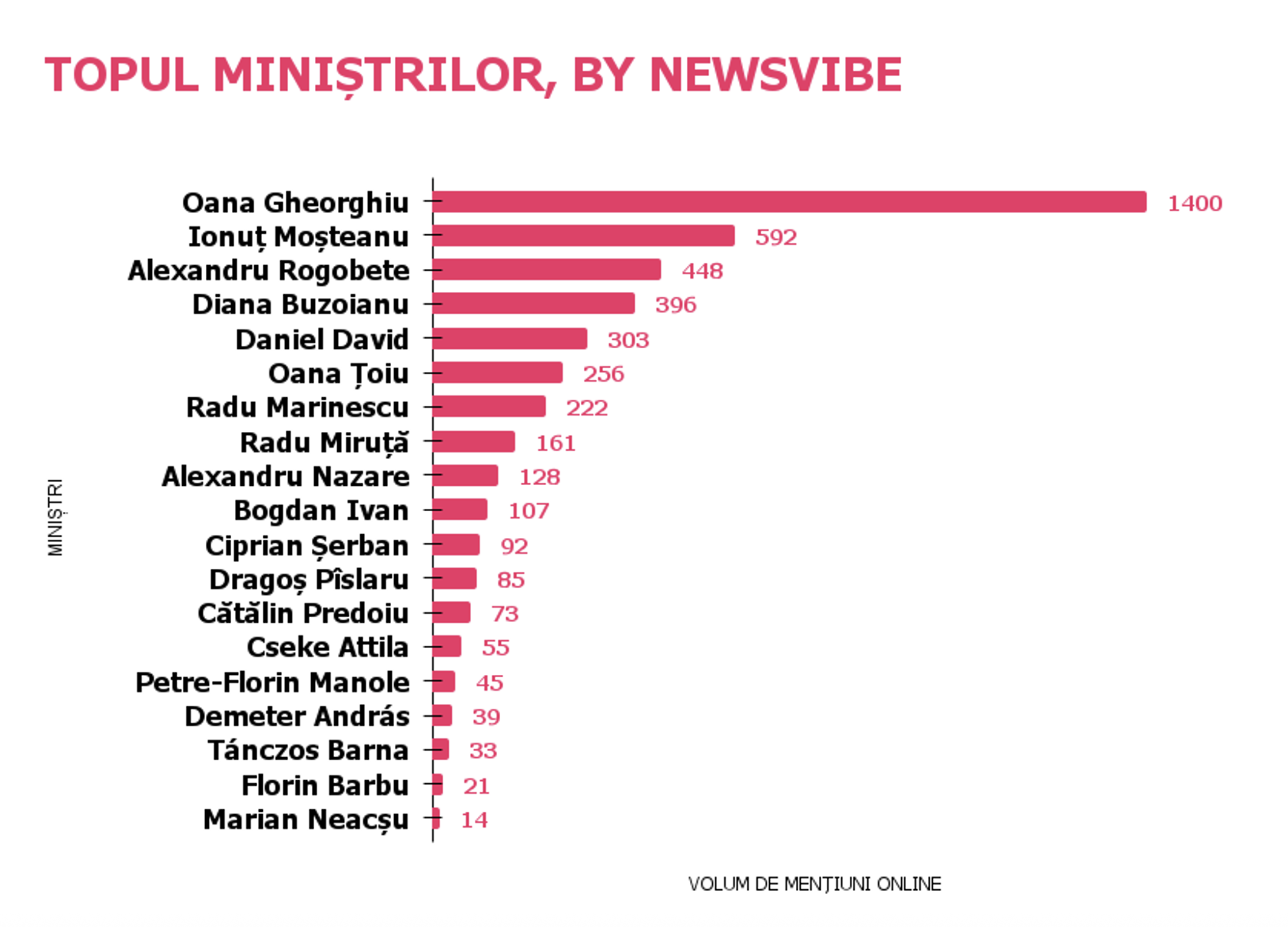 En la categoría de ministros mencionados en un contexto positivo se destacan Diana Buzoianu, visible especialmente en el tema de la administración de las playas y en el de los osos que entran en áreas urbanas y representan un peligro para la vida de las personas, y Alexandru Rogobete, cuya visibilidad ha venido en el contexto de la transmisión de mensajes centrados en la transparencia y modernización en el sistema médico.