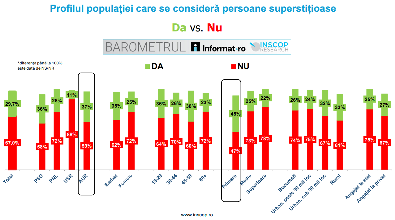 Se consideran personas supersticiosas sobre todo: los votantes del PSD y AUR, los hombres, las personas con educación primaria, los habitantes del medio rural y de la pequeña urbanidad. No se consideran personas supersticiosas en especial: los votantes del USR, las mujeres, aquellos con educación superior.