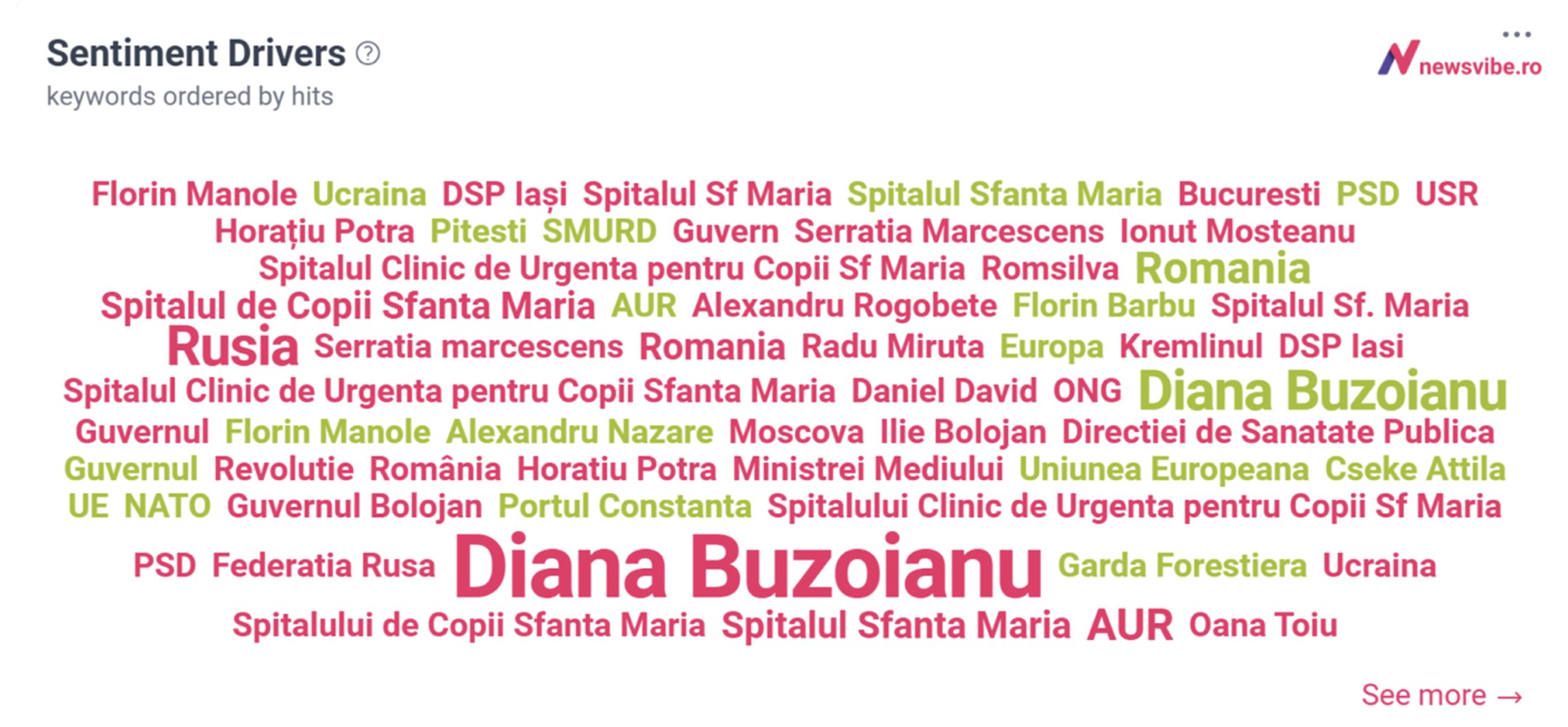 La nivel tematic, un ton negativ în cadrul conversațiilor despre miniștri a existat și în legătură cu Rusia, AUR sau Spitalul Sfânta Maria.