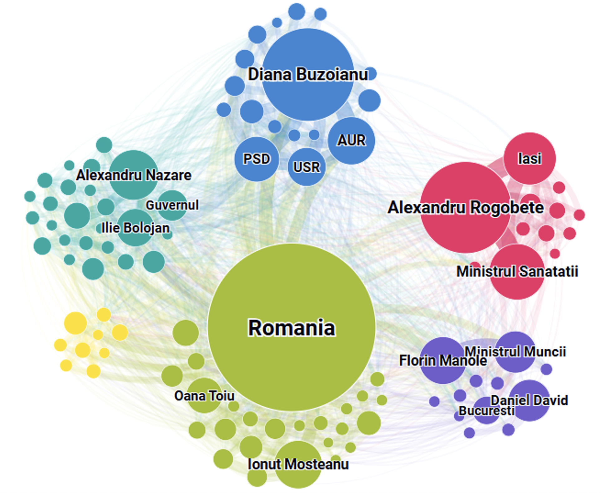 România rămâne cel mai mare nod din rețea, poziționat central în structura acesteia, în interiorul unui cluster care conține și numele unor miniștri precum Oana Țoiu (USR) și Ionuț Moșteanu, asociați prin prisma temelor de securitate și politică externă.