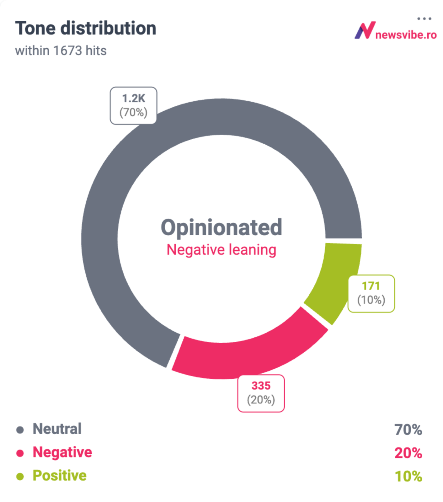 CUM SE DEZBATE ONLINE TEMA? Analiza de sentiment NewsVibe, bazată pe un motor AI de procesare lingvistică de înaltă acuratețe, evaluează automat tonul reflectării online a temei – care este puternic emoțională (procentul de numai 70% pondere a mențiunilor neutre ilustrează un subiect disputat).