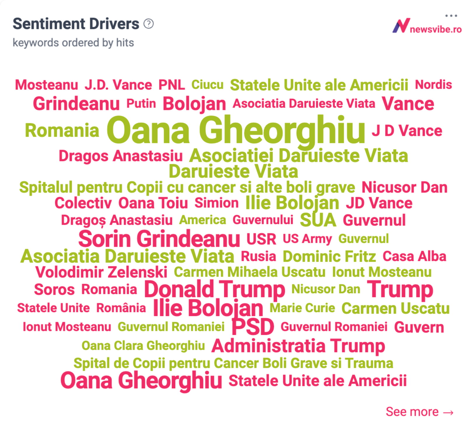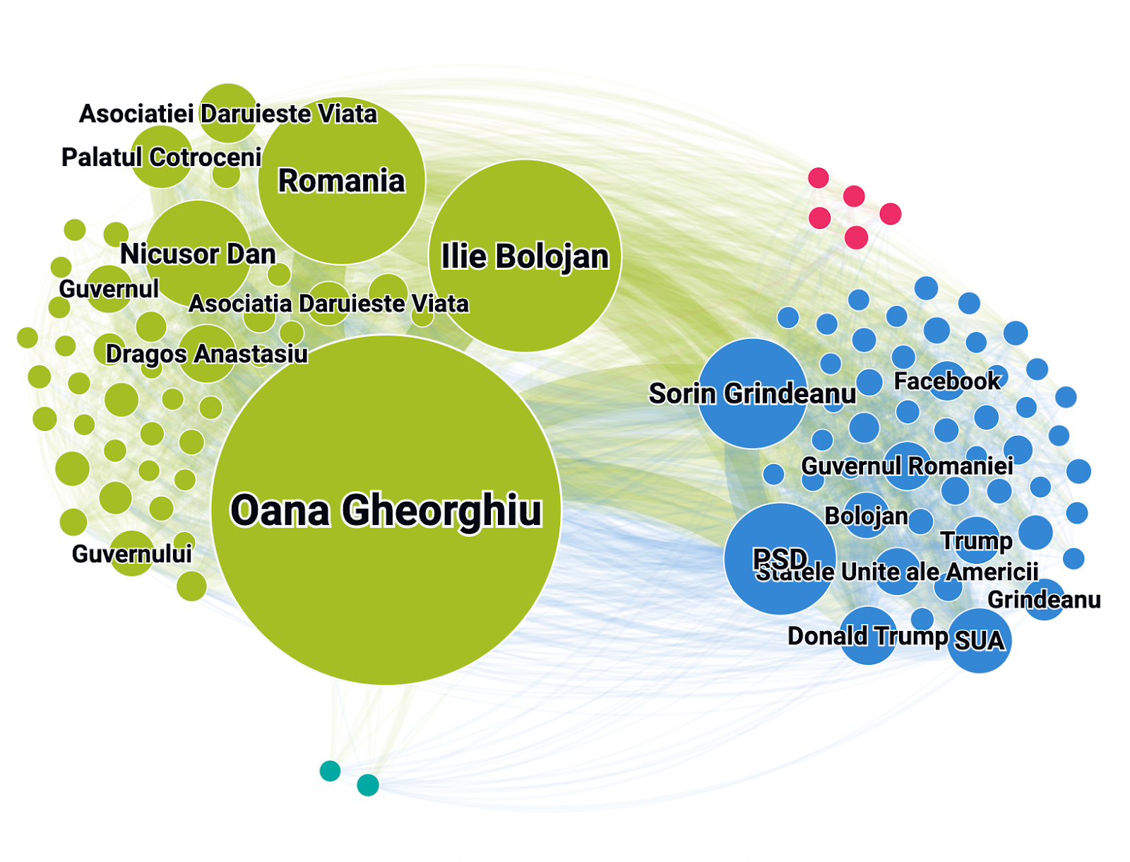 Termenii prezenți în context negativ sunt dominați de numele Donald Trump – postarea mai veche a noului vicepremier despre președintele american fiind motivația atacurilor la adresa Oanei Gheorghiu, precum și Sorin Grindeanu, liderul PSD care a cerut retragerea nominalizării.