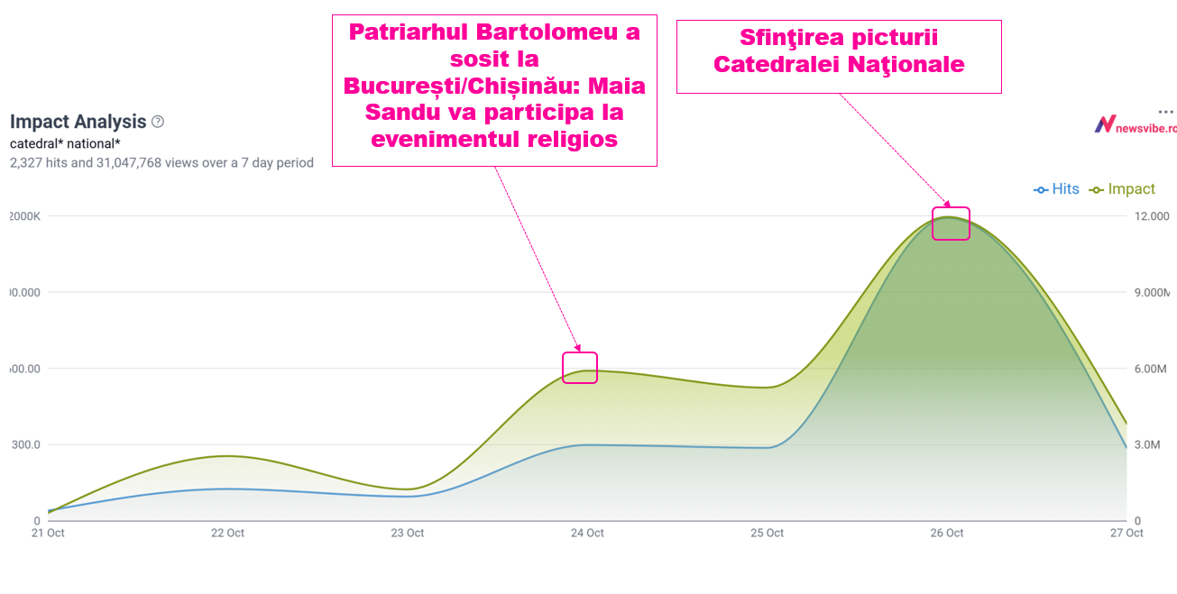 Le volume et l'impact des mentions concernant le lieu de culte ont commencé à croître quelques jours avant le 26 octobre, sur fond d'anticipation de l'événement de consécration, mais aussi d'autres moments connexes - la venue en Roumanie du Patriarche Bartholomée de Constantinople, les annonces concernant le programme officiel du 26 octobre, ainsi que la confirmation de la présence de certains dirigeants politiques nationaux et internationaux, comme ce fut le cas de Maia Sandu, présidente de la République de Moldavie.