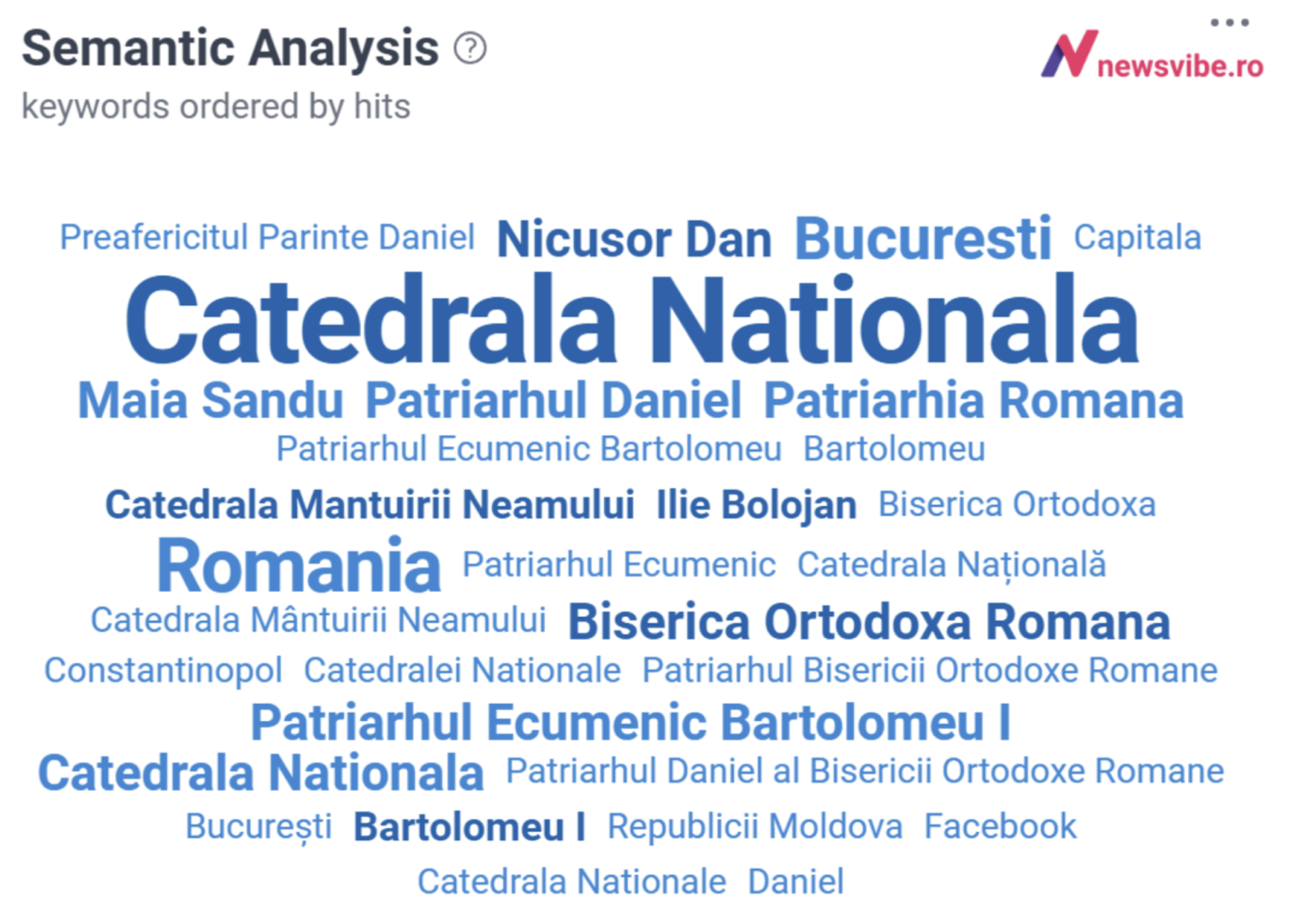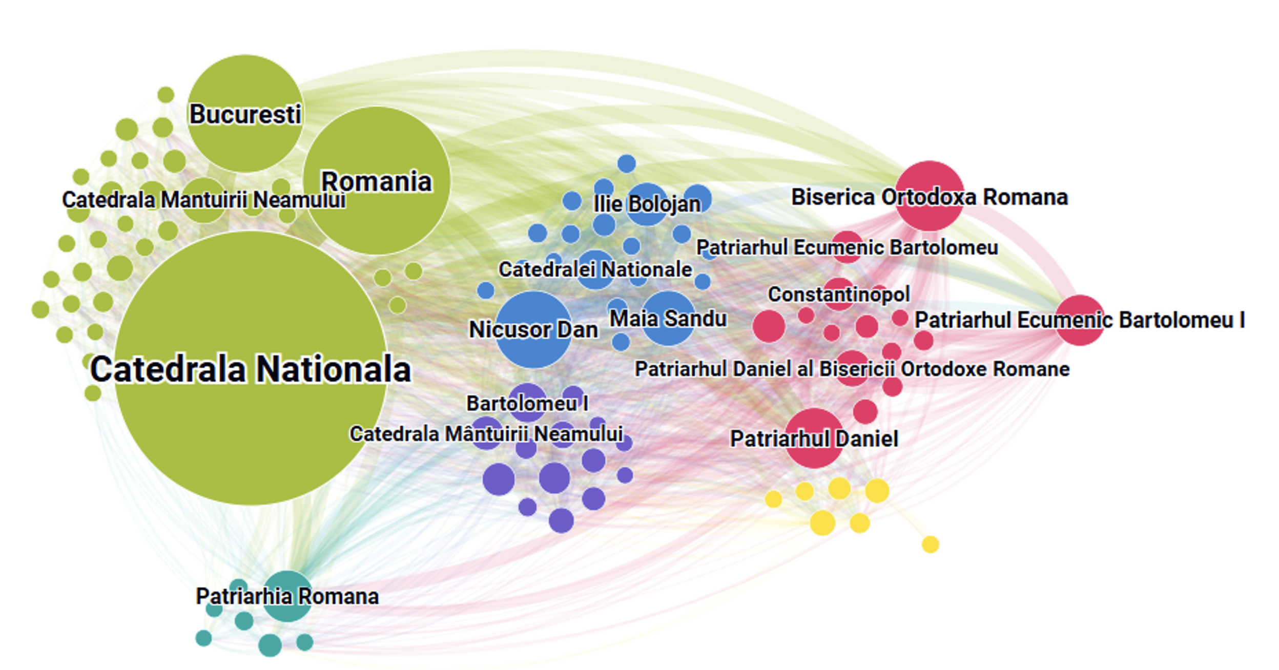 Les entités les plus fréquemment et fortement associées au lieu de culte, dans les articles publiés sur les sources web et dans les publications sur les réseaux sociaux, sont, au-delà de son nom - Cathédrale Nationale, des termes tels que Roumanie, Église Orthodoxe Roumaine, Patriarche Œcuménique Bartholomée I, Bucarest, mais aussi Nicușor Dan et Maia Sandu.