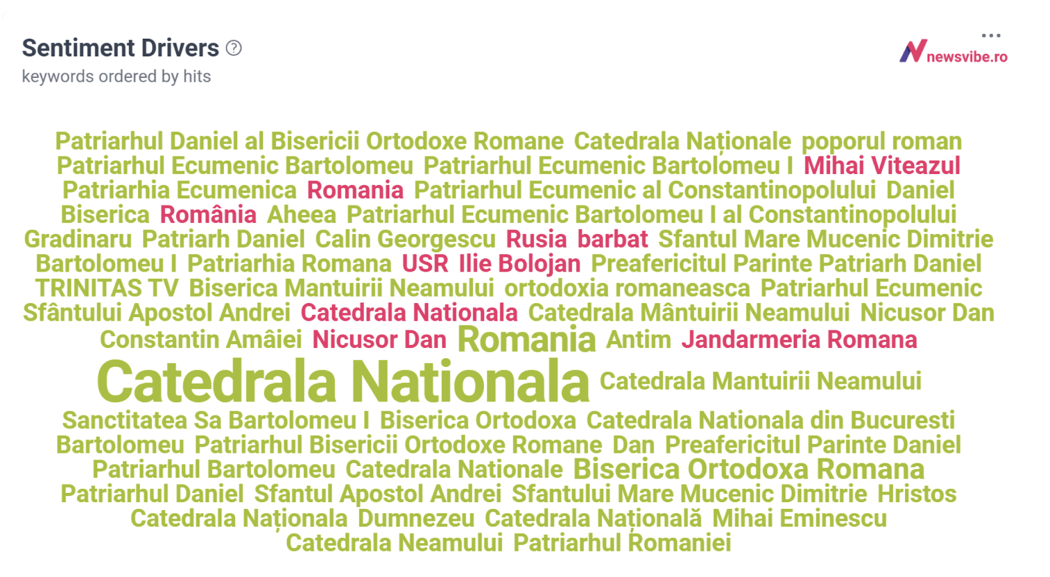 - Cathédrale Nationale (dans ses multiples formes de mention), aux côtés des noms des dirigeants religieux - Patriarche Daniel et Patriarche Bartholomée I - ou de diverses fêtes religieuses, se retrouvent principalement dans des contextes conversationnels favorables.