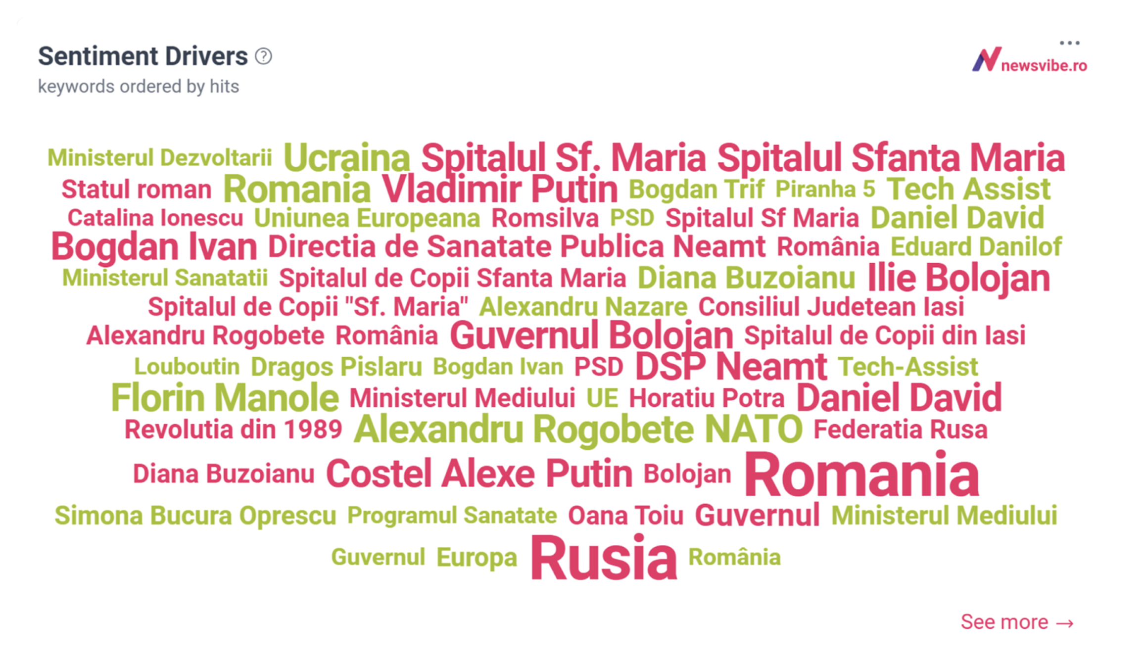 Un tono negativo associato alle conversazioni sui ministri è esistito anche in relazione a Russia, Vladimir Putin, Ospedale Sfânta Maria, DSP Neamț o Costel Alexe.