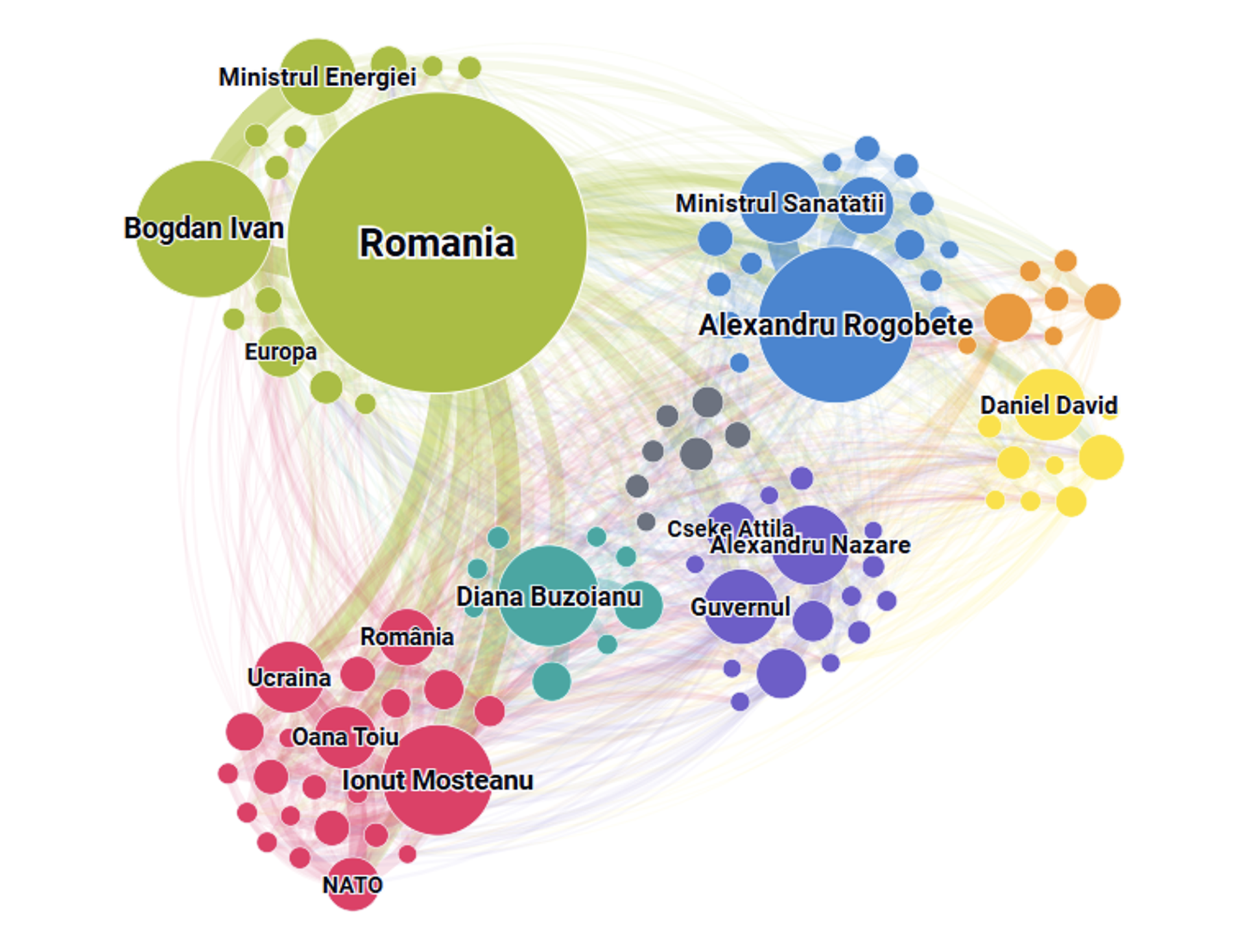 Un'altra area importante di dibattito riguarda il settore della difesa e la politica estera. Qui si trovano i ministri Ionuț Moșteanu e Oana Țoiu (USR), associati a attori internazionali come la NATO e l'Ucraina. L'alta connettività di questo cluster indica che i temi di sicurezza e cooperazione regionale sono stati intensamente riflessi nello spazio online e in questa settimana.