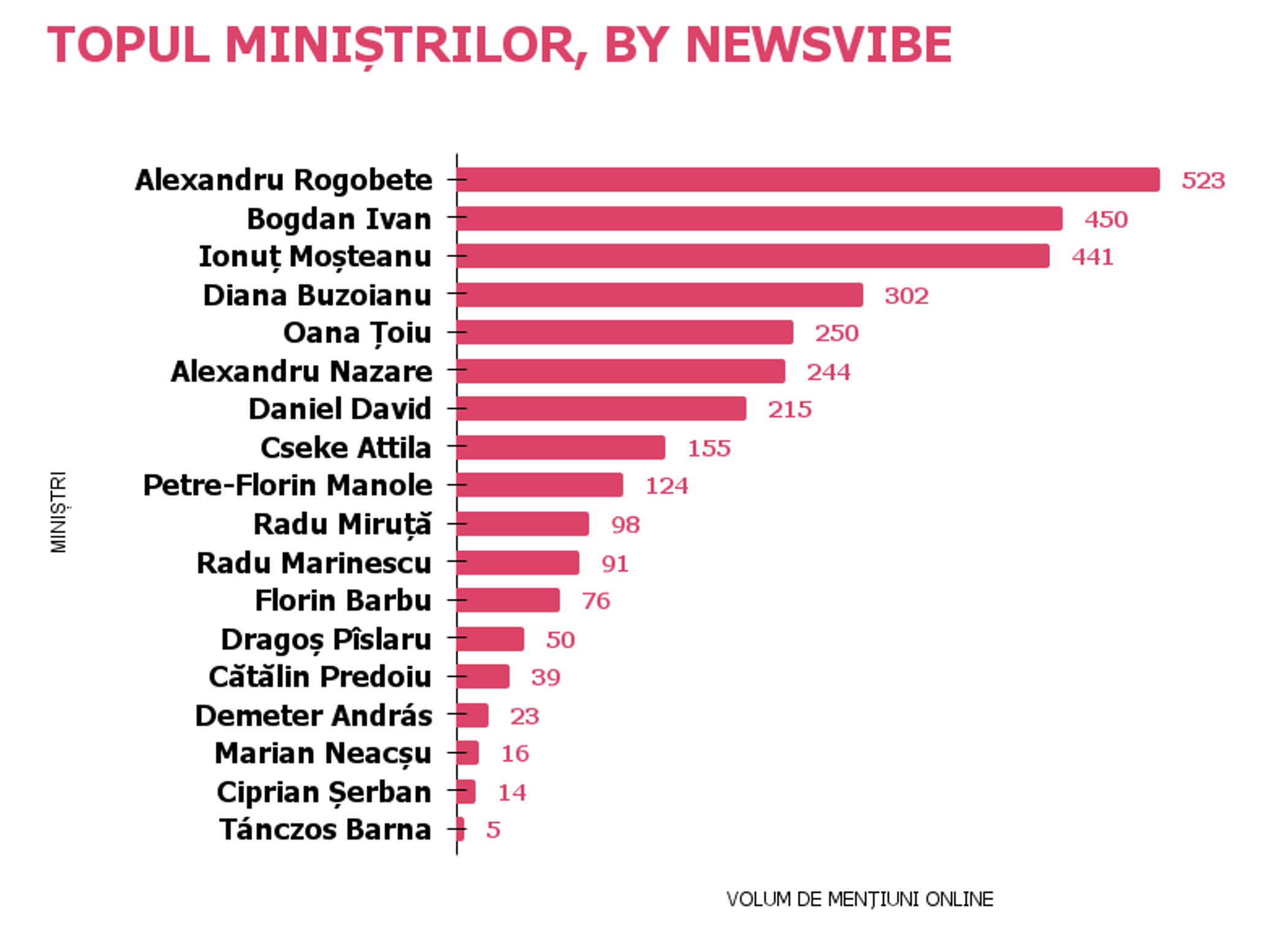 La piattaforma NewsVibe utilizza tecnologie basate su intelligenza artificiale per analizzare il tono e l'orientamento delle conversazioni nello spazio online riguardanti vari temi e attori pubblici. L'analisi di cui sopra ha riguardato tutte le menzioni nel contesto digitale che fanno riferimento ai ministri del Governo della Romania.
