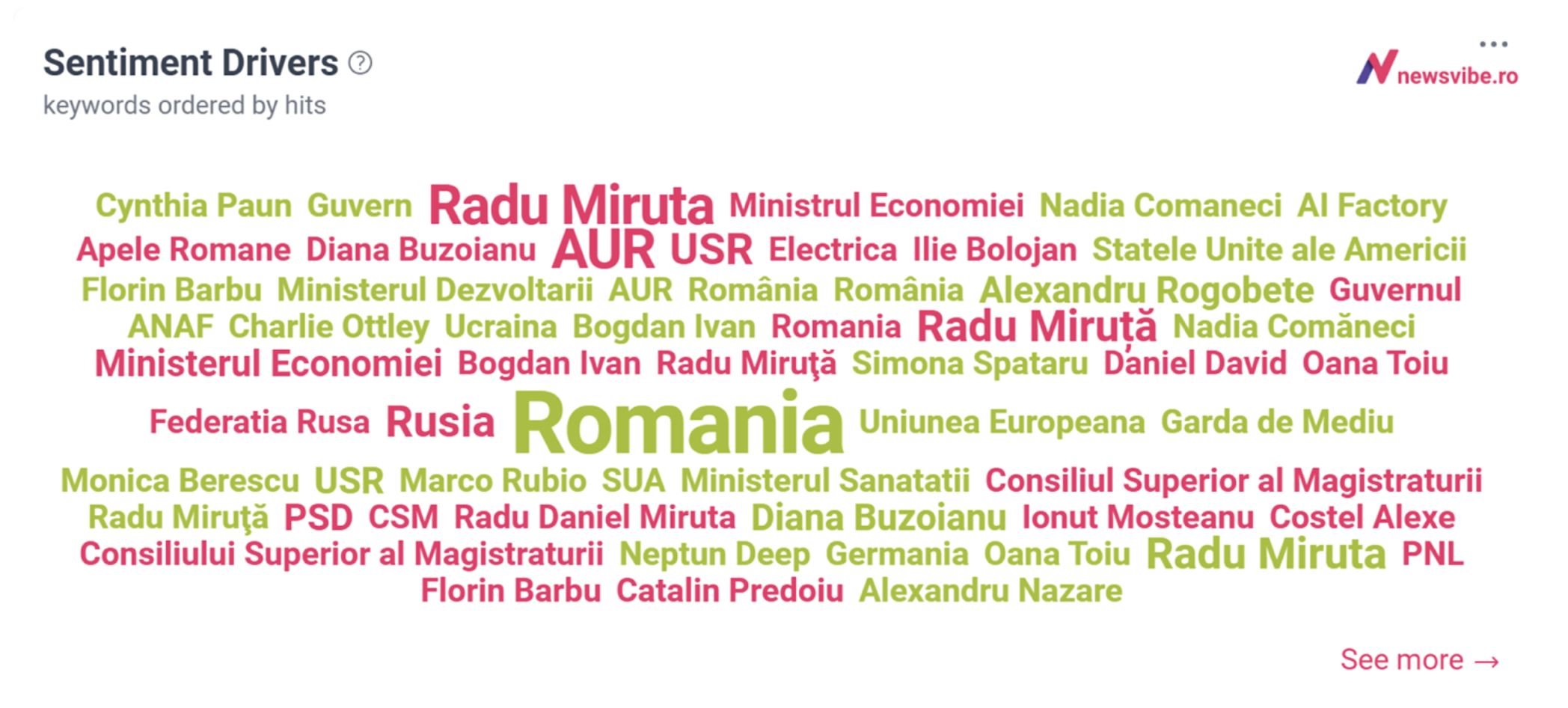 Le discussioni online con tonalità positiva pongono in primo piano i ministri Alexandru Rogobete (PSD) – che ha annunciato controlli nelle cliniche private in tutto il paese (dopo la morte di una giovane a Costanza), così come la presenza del vaccino antinfluenzale nella maggior parte delle farmacie – e Diana Buzoianu (USR), che ha attirato l'attenzione con l'iniziativa legislativa che prevede pene detentive per la costrizione ai matrimoni o convivenze, ma anche per la sua posizione riguardo ai progetti ambientali nel PNRR e l'utilizzo del sistema RO-Alert.