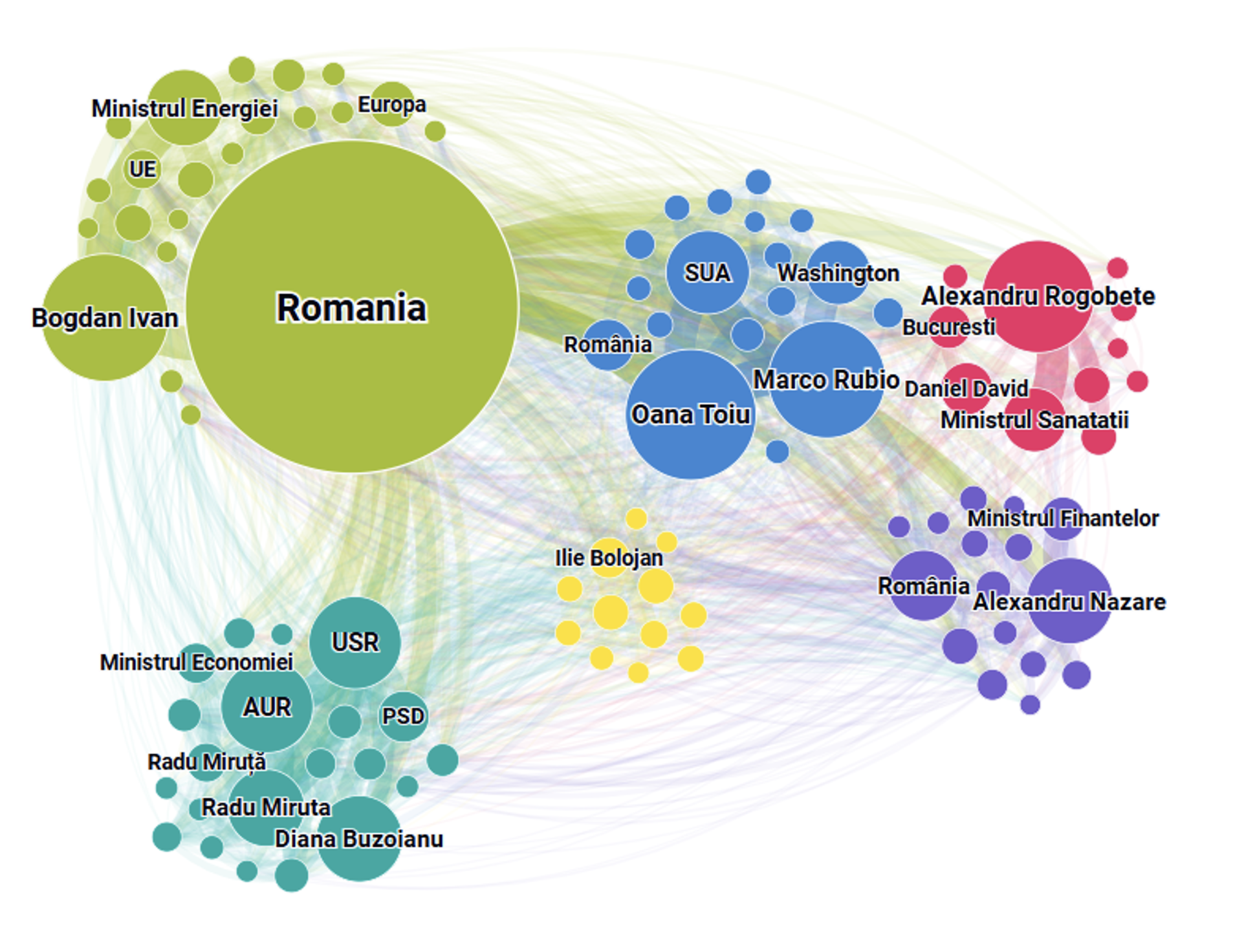 Si distingue anche un gruppo compatto e ben definito, ma connesso più debolmente alle conversazioni tematiche, in cui si individualizza il premier Ilie Bolojan.