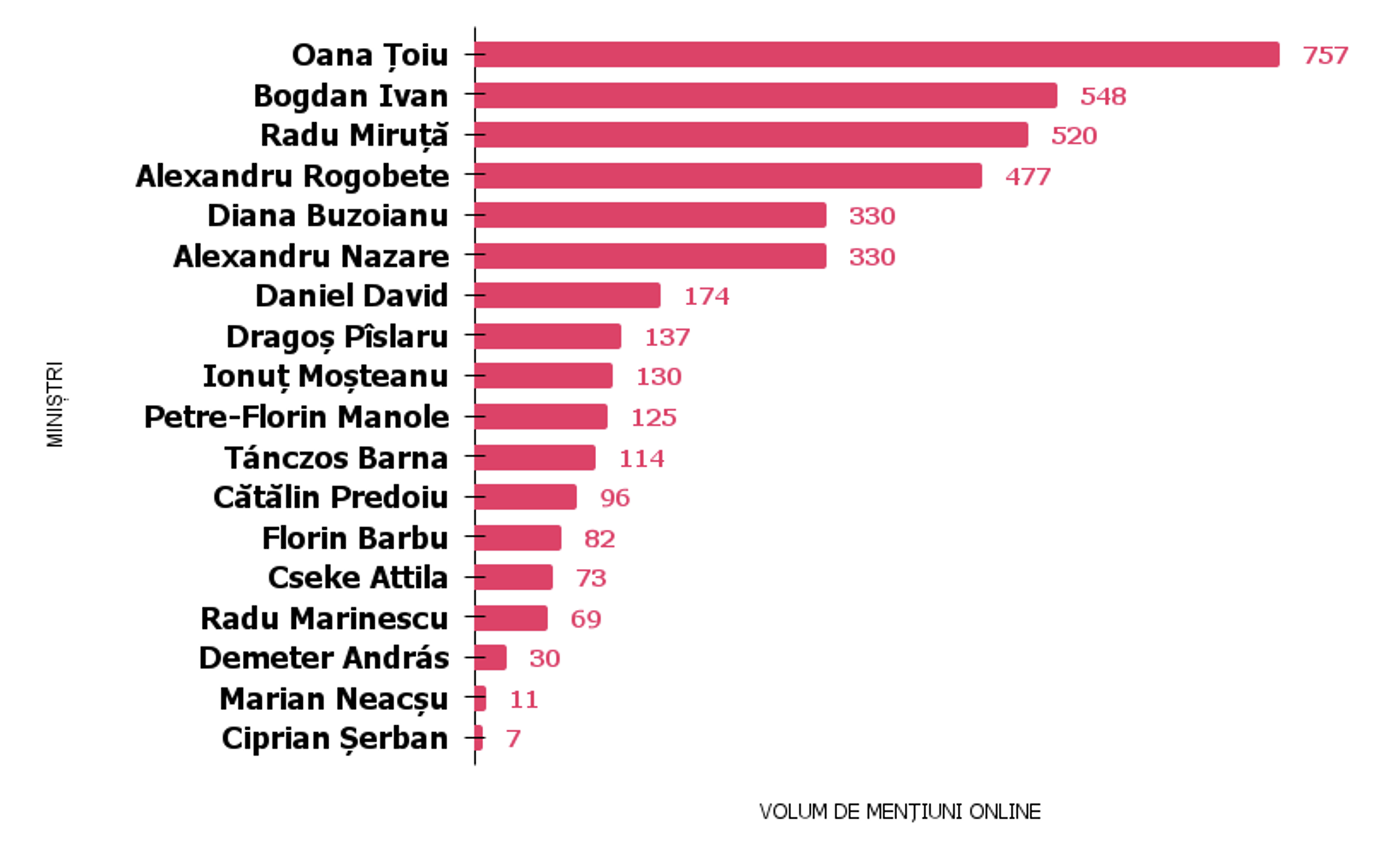 In confronto, il premier Ilie Bolojan (che non è incluso nell'analisi) ha registrato oltre 3.600 menzioni, poco sotto i valori sommati di tutti gli altri membri del Governo.