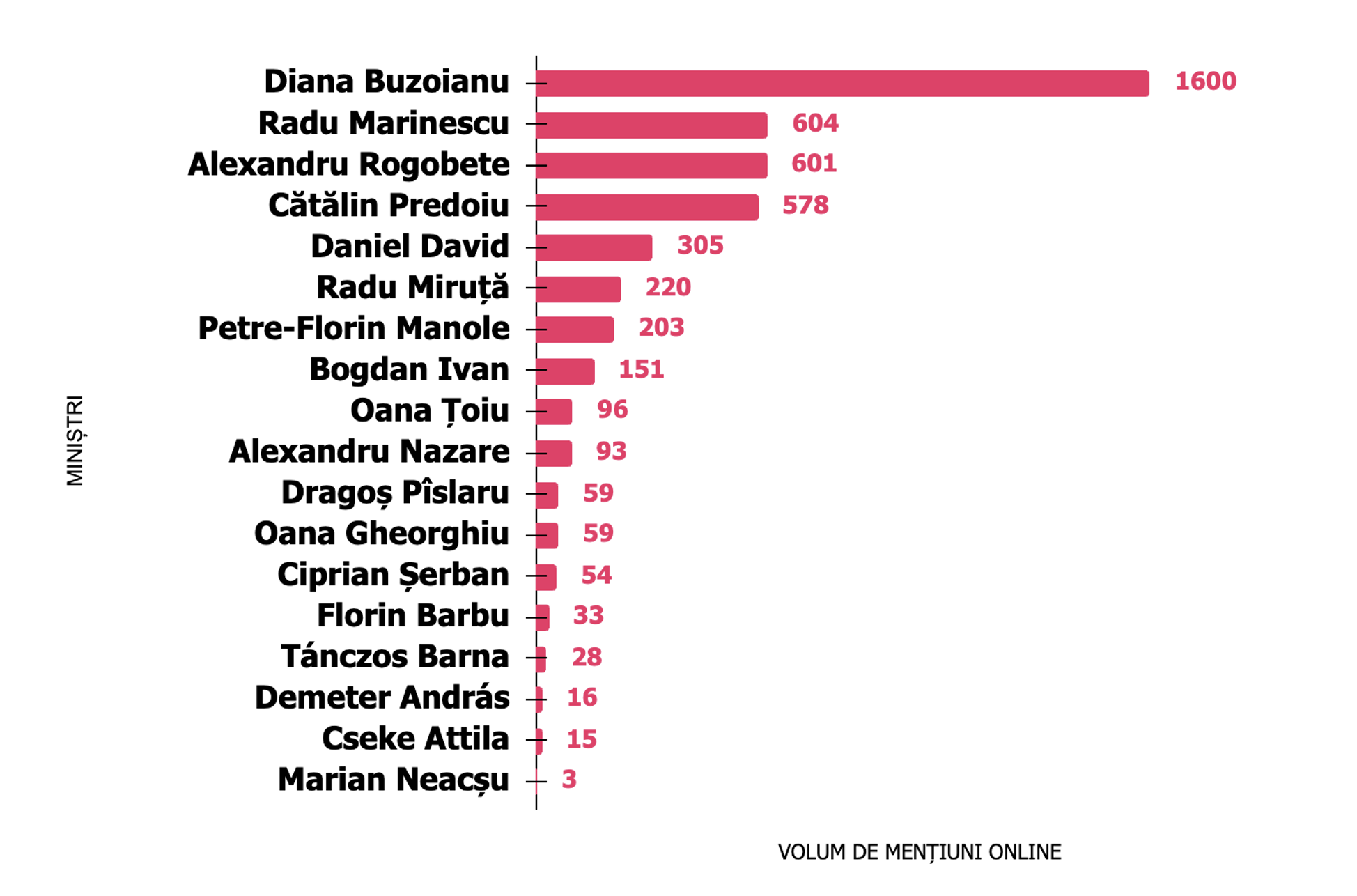 大臣の可視性におけるトレンド。 ダイアナ・ブゾイアヌは、上昇トレンドを維持していますが、可視性のネガティブなレジストリによって特徴付けられています。 ラドゥ・マリネスクは、重要な増加を記録していますが、同様にネガティブな背景があります。 カトリン・プレドイウ(PNL)も目立ち、言及の数が顕著に増加し、司法に関する抗議の背景で議論のトーンが深くネガティブです。 ダニエル・ダビッドは下降トレンドにあり、ネガティブな文脈で言及されています - 教師と学生の抗議、そして教育基準の可能な引き上げに関する公共の場での情報が含まれます。