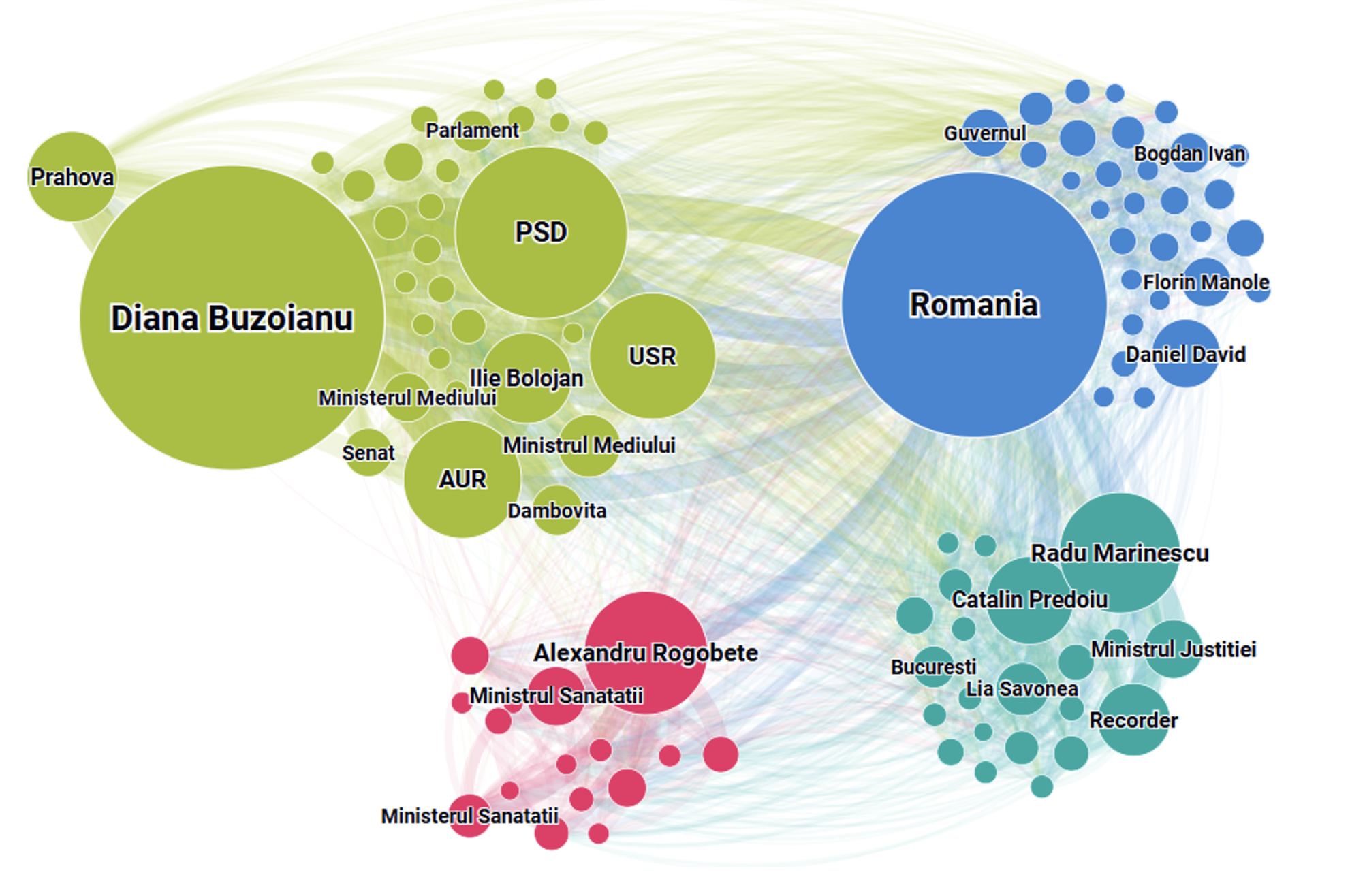 もう一つの重要なクラスターは、ルーマニアというノードを中心に構築され、政府に関連する制度的な領域を対象としています。ここには、ボグダン・イヴァン、フロリン・マノレ(PSD)、ダニエル・ダビッドが配置されており、政府の決定と国家的な関連性を持つポジショニングに向けた議論の枠組みを示しています。