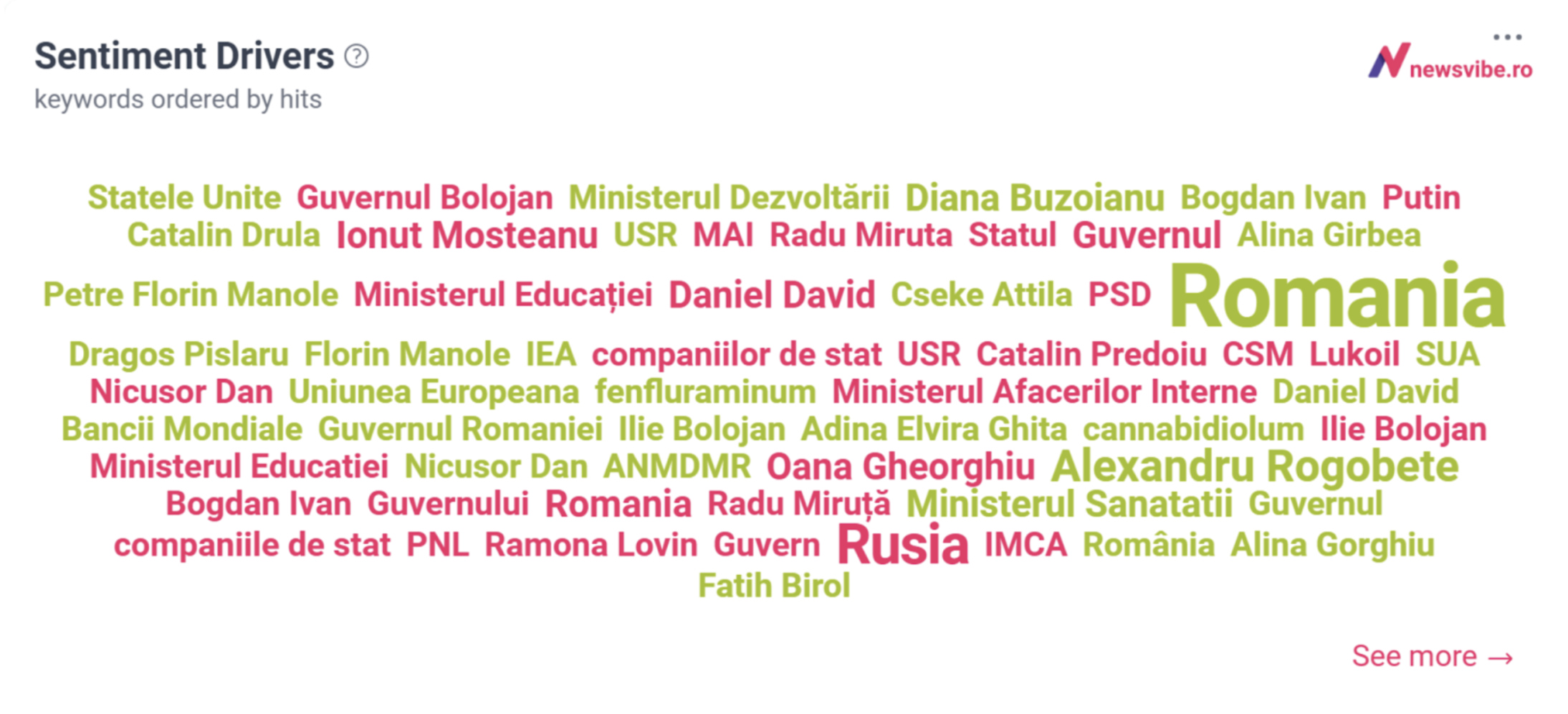 公共トーンのバロメーター。エンティティレベルの感情分析は、アレクサンドル・ロゴベテ大臣の名前をポジティブな文脈で浮き彫りにしています。同じポジティブな可視性の枠組みには、ダイアナ・ブゾイアヌ(USR)も含まれており、彼女は都市の緑地での樹木伐採に対する刑事罰を規定する法令案を公表したことを発表し、「ラブラ」プログラムが2026年に継続しない可能性があることも示唆しています。
