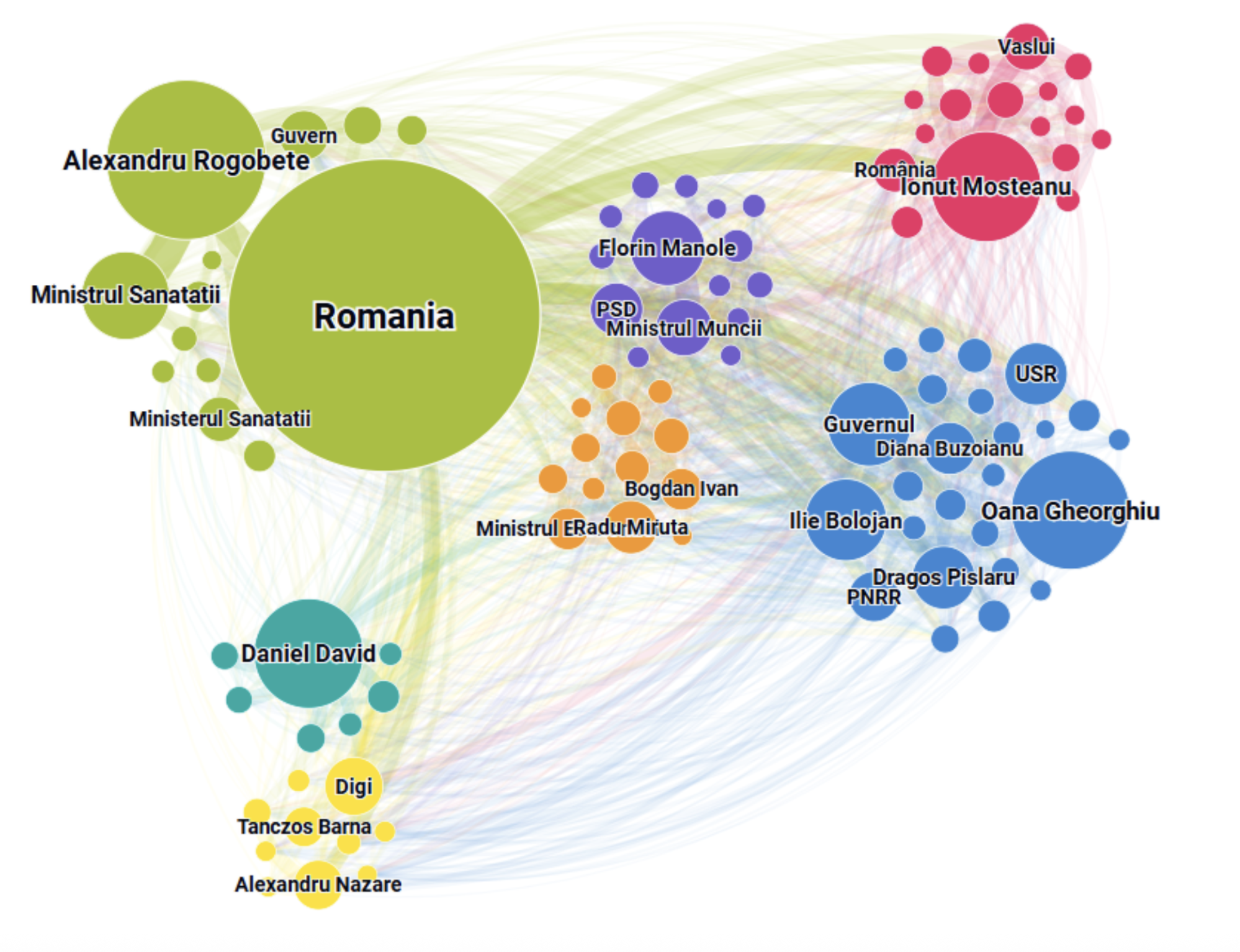 ネットワーク内で最も大きく、最も密なクラスターはルーマニアを中心にしており、これはアレクサンドル・ロゴベテおよび健康省と強く結びついており、健康分野に関する公共の議論での言及が集中していることを示しています。