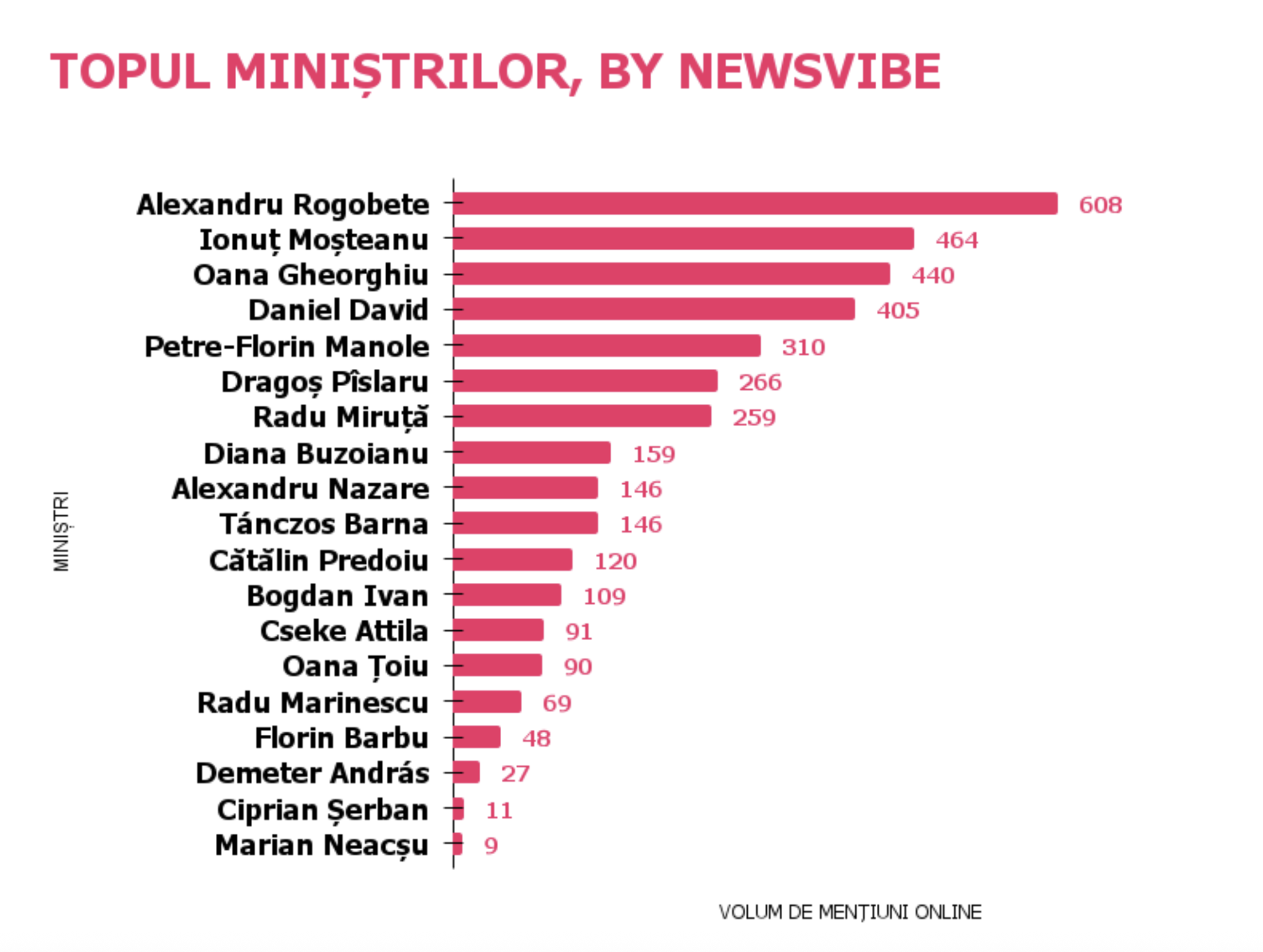 NewsVibeプラットフォームは、デジタルツールを使用してオンライン環境での会話を分析し、さまざまなトピックがどのように扱われ、公共の人物がどのように反映されているかを捉えています。このレポートでは、ルーマニア政府のメンバーが言及されているすべてのデジタル空間での出現が考慮されています。