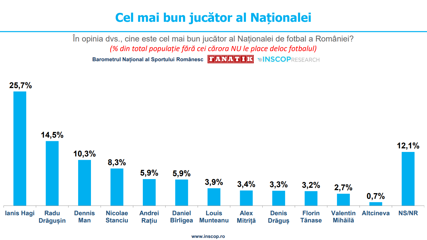 ナショナルチームのベストプレーヤーはラドゥ・ドラグシンだと考えているのは、特に30歳未満の若者、ブカレストの住民、高等教育を受けた人々、高所得者です。