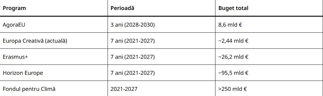 În contrapartidă, AgoraEU (2028-2030) vine cu resursele concrete: un buget total de 8,6 miliarde de euro pentru trei ani – aproape dublu față de ritmul actual. Programul integrează cultura, media și societatea civilă: Creative Europe – Culture strand: 1,8 miliarde € MEDIA+ strand: 3,2 miliarde € Democracy, Citizens, Equality, Rights and Values: 3,6 miliarde € Cifrele merită contextualizate. Comparativ cu domeniile prioritare ale UE, investiția rămâne modestă:
