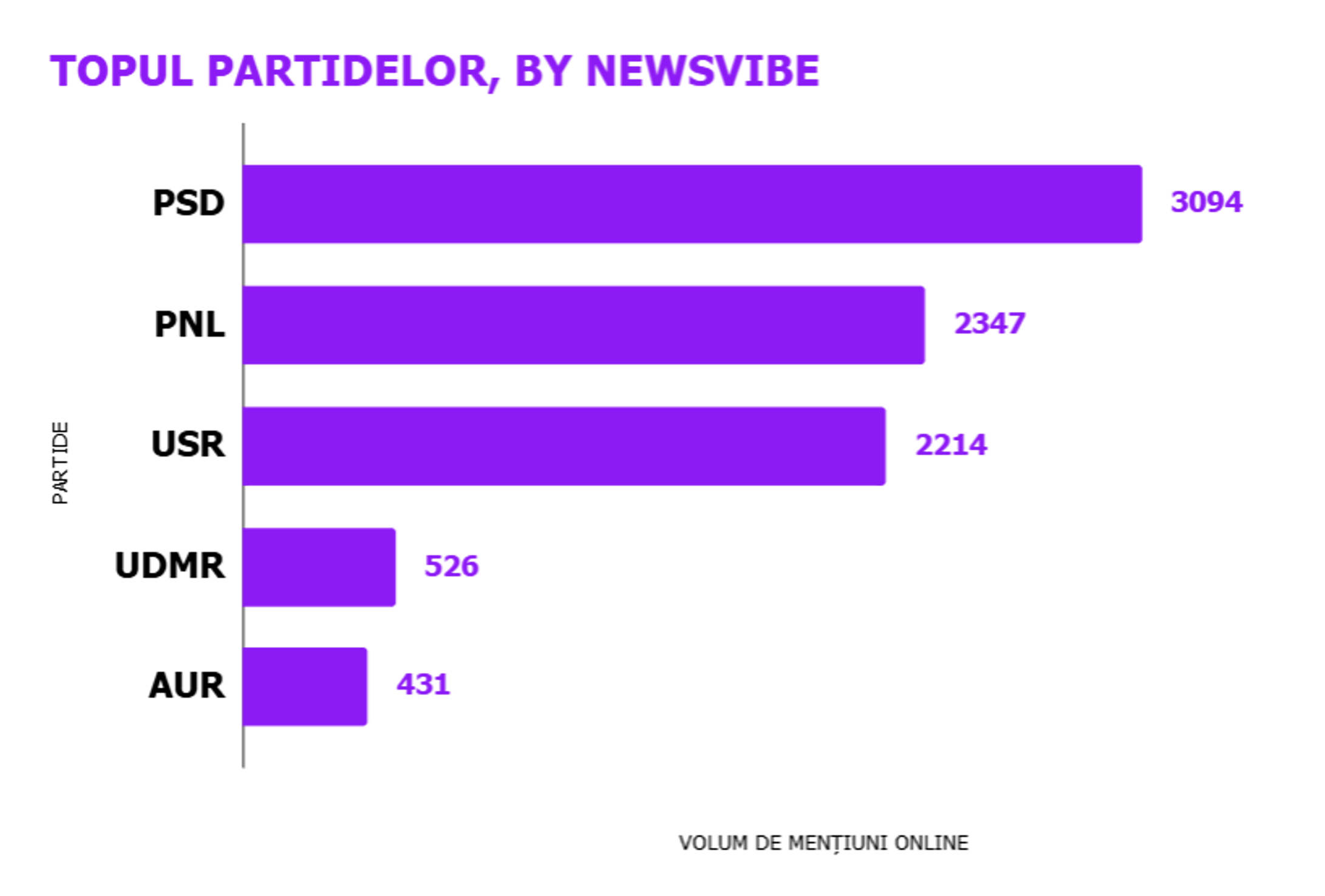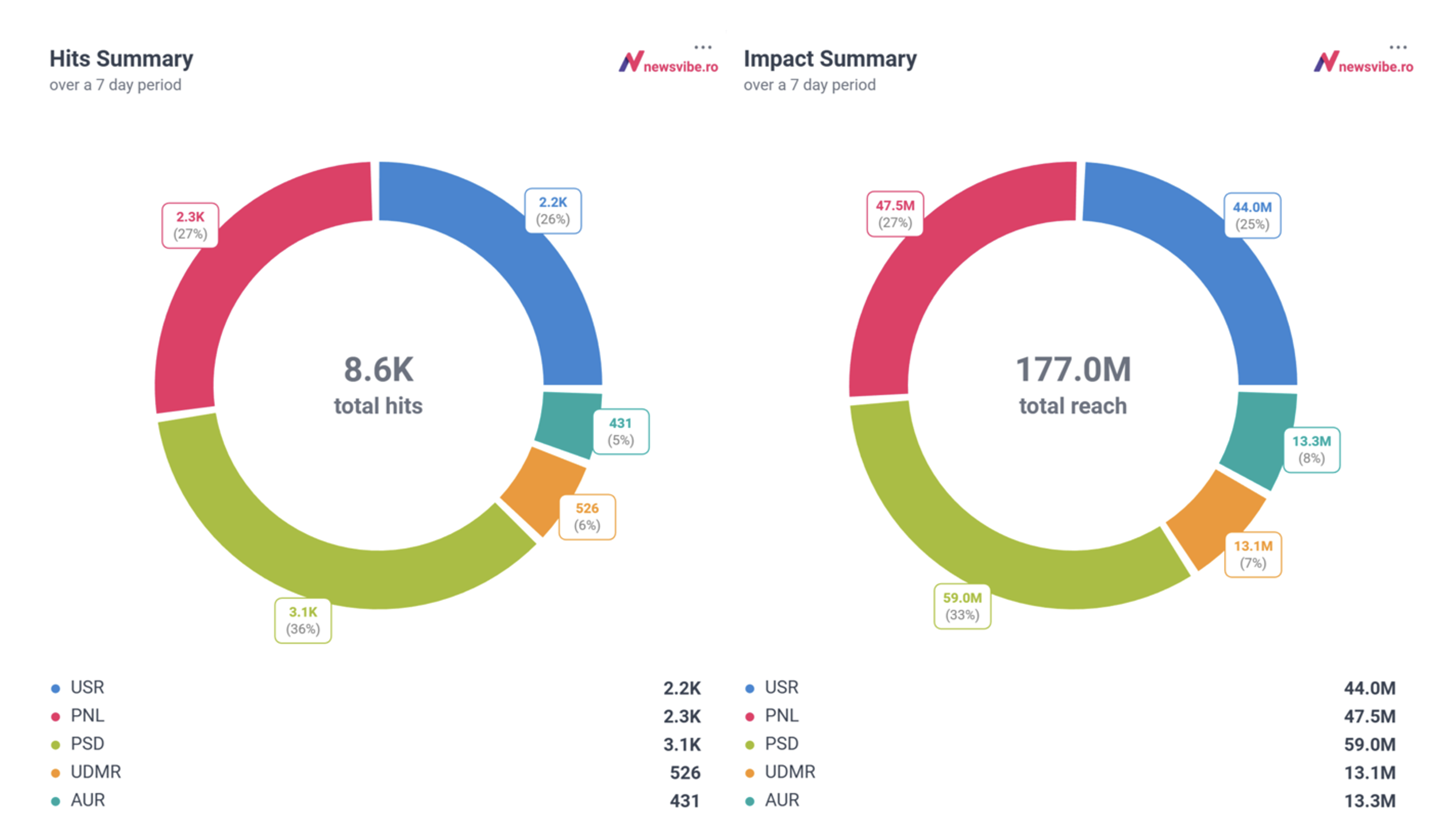 Партии в коалиции продолжают доминировать по сравнению с AUR: они генерируют 95% от общего числа упоминаний и 93% от прогнозируемого влияния. В то же время, хотя глобальное влияние упоминаний о AUR остается низким, оно все же превышает влияние упоминаний о UDMR — даже несмотря на то, что UDMR имеет почти 100 упоминаний больше в этот период.