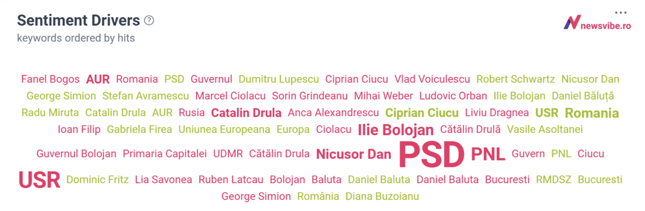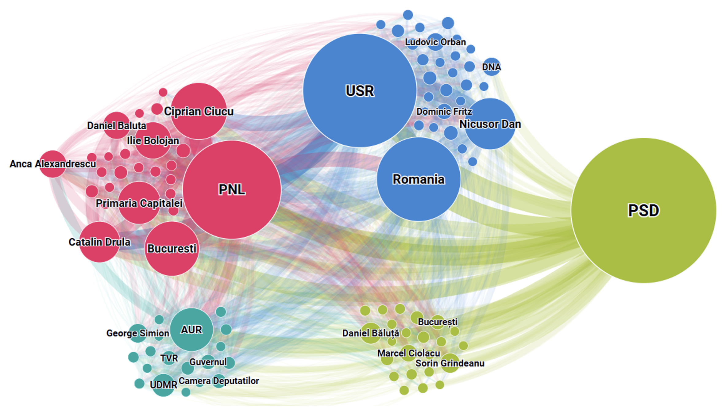 - PSD, прежде всего, USR и PNL – это партии, которые чаще всего упоминаются в напряженных/негативных контекстах. Этот тип освещения в онлайн-источниках определяется как (пред)кампанией в Бухаресте, которая усиливается, так и спорами внутри коалиции по вопросам управления.
