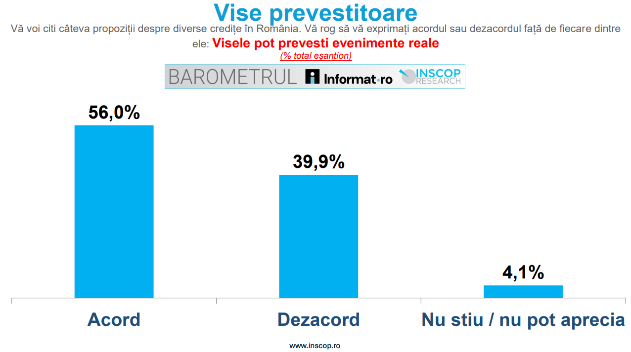 56% опрошенных считают, что „Сны могут предсказывать реальные события”, в то время как 39.9% не согласны. Доля неответивших составляет 4.1%.
