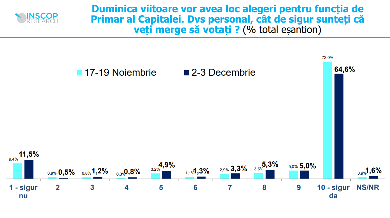 По шкале от 1 до 10, где 1 означает, что ”sure нет” пойдут на выборы, а 10 ”sure да” пойдут на выборы, 11.5% жителей Бухареста выбрали 1, 0.5% выбрали 2, 1.2% выбрали 3, 0.8% выбрали 4, 4.9% выбрали 5, 1.3% выбрали 6, 3.3% выбрали 7. 5.3% указывают 8, 5% 9 и 64.6% указывают 10. 1.6% знают или не отвечают на этот вопрос.