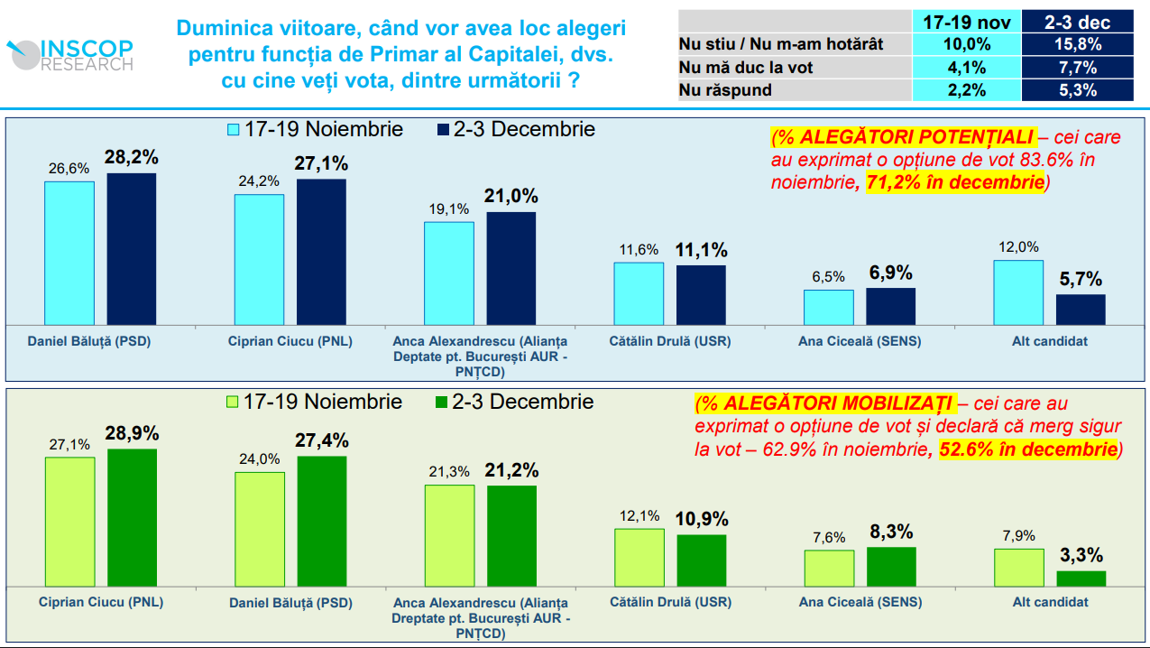 Среди тех, кто точно пойдет на выборы (то есть 52.6% от общего числа выборки), 28.9% проголосовали бы за Чиприана Чиуку (PNL) в качестве мэра муниципалитета Бухарест (по сравнению с 27.1% в ноябре), 27.4% за Даниэля Бэлэца (PSD) (по сравнению с 24% в ноябре), а 21.2% за Анку Александреску (независимую, поддерживаемую AUR и PNȚCD) (по сравнению с 21.3% в ноябре). 10.9% жителей Бухареста выбрали бы Кэталина Друлу (USR) (по сравнению с 12.1% в ноябре), а 8.3% за Ану Чичелу (SENS) (по сравнению с 7.6% в ноябре). 3.3% указывают на другого кандидата (по сравнению с 7.9% в ноябре).