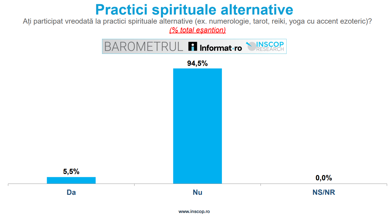 5.5% dintre respondenți au participat la practici spirituale alternative (ex. numerologie, tarot, reiki, yoga cu accent ezoteric), iar 94.5% spun că nu au luat parte la astfel de practici. Nu există non-răspunsuri la această întrebare.