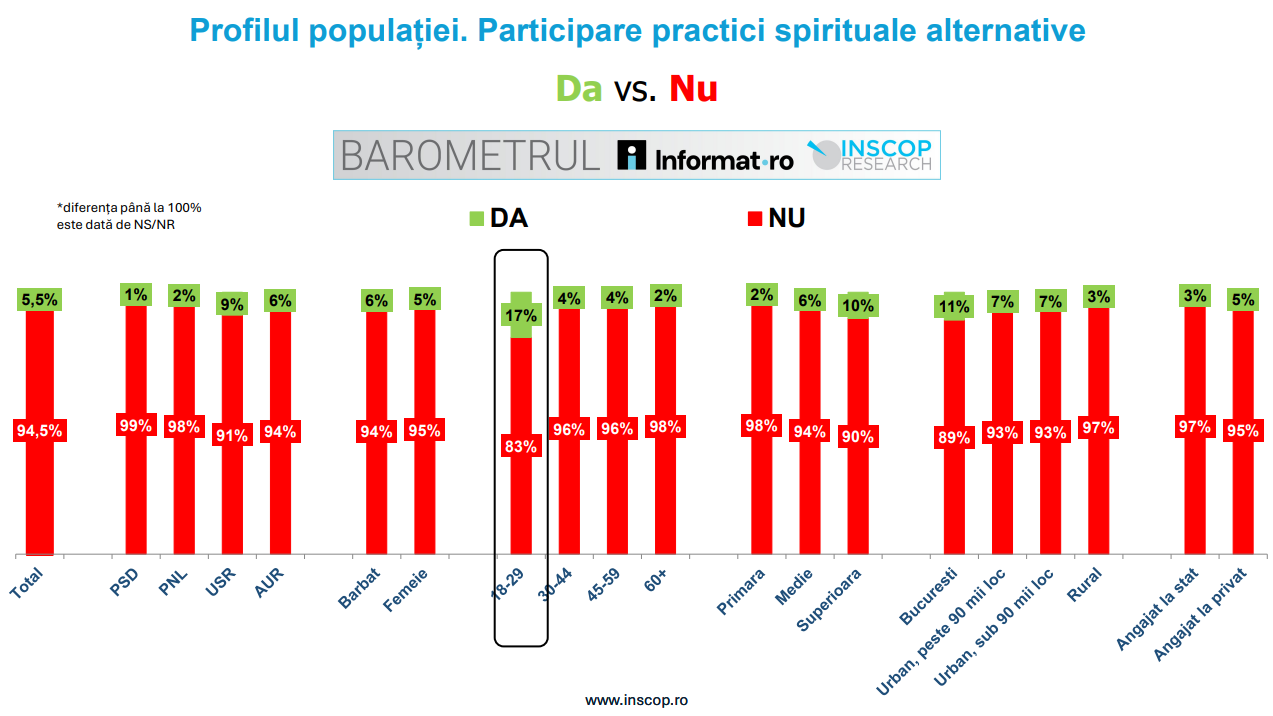 Au luat parte la practici spirituale alternative în special: tinerii sub 30 de ani, locuitorii din București, persoanele cu studii superioare. Nu au participat la astfel de practici mai ales: votanții PSD, persoanele de peste 60 de ani, cei cu studii primare, locuitorii din mediul rural.