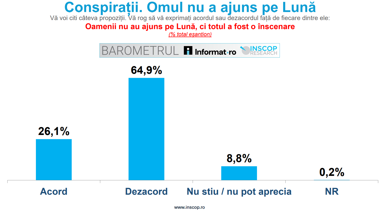Afirmația „Oamenii nu au ajuns pe Lună, ci totul a fost o înscenare” întrunește acordul a 26.1% dintre respondenți. 64.9% își exprimă dezacordul, 8.8% nu știu sau nu pot aprecia, iar 0.2% nu răspund.